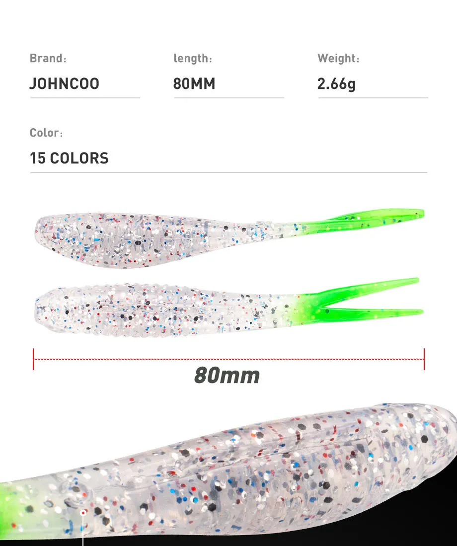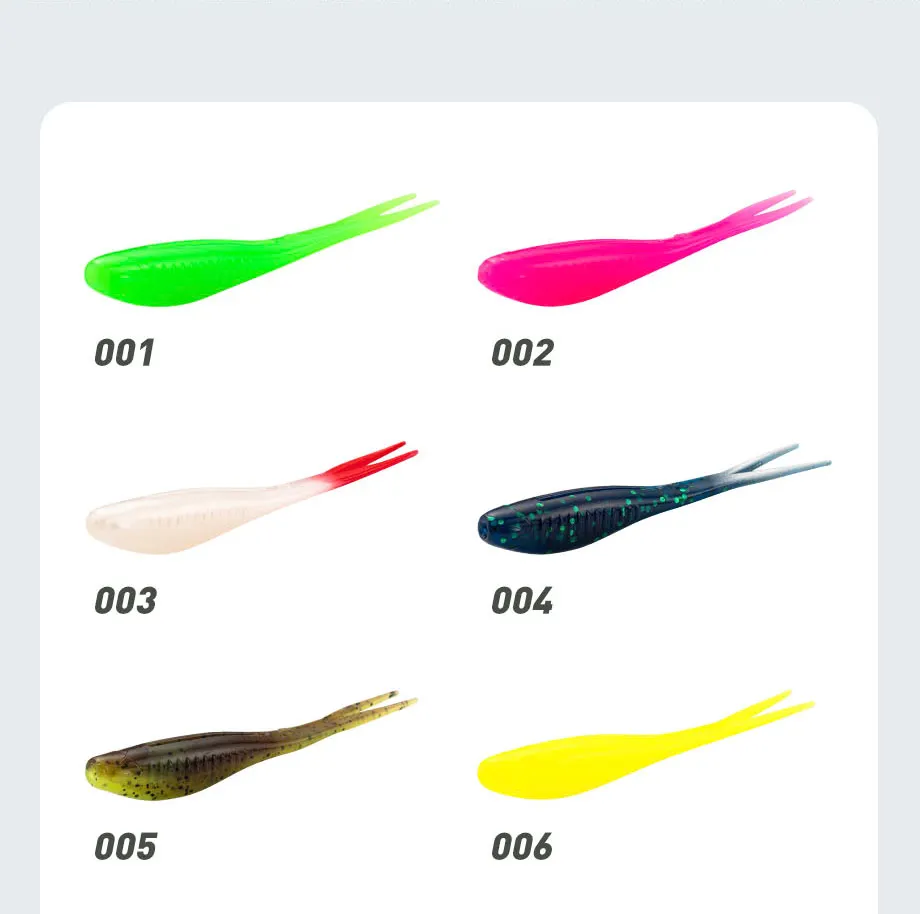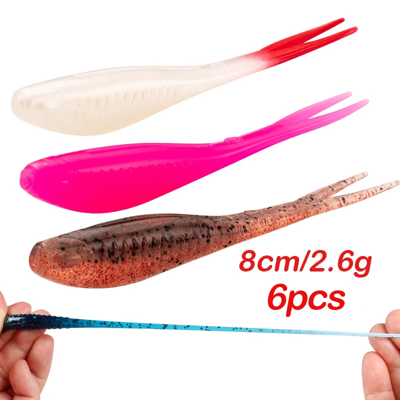 JOHNCOO-Señuelo de pesca suave de 8cm, 2,6G, Minnow Shad Drop Shot, cebos de pesca de material TPR con cola dividida flotante de 6 piezas