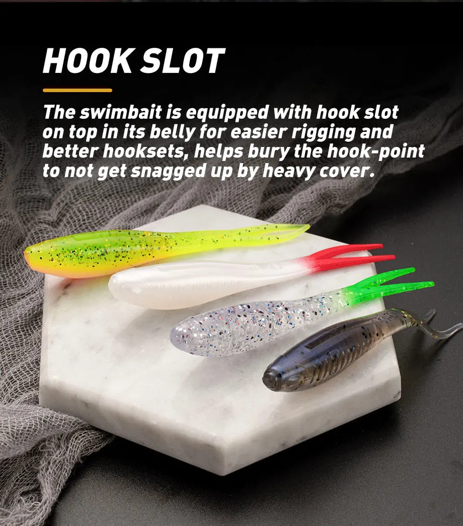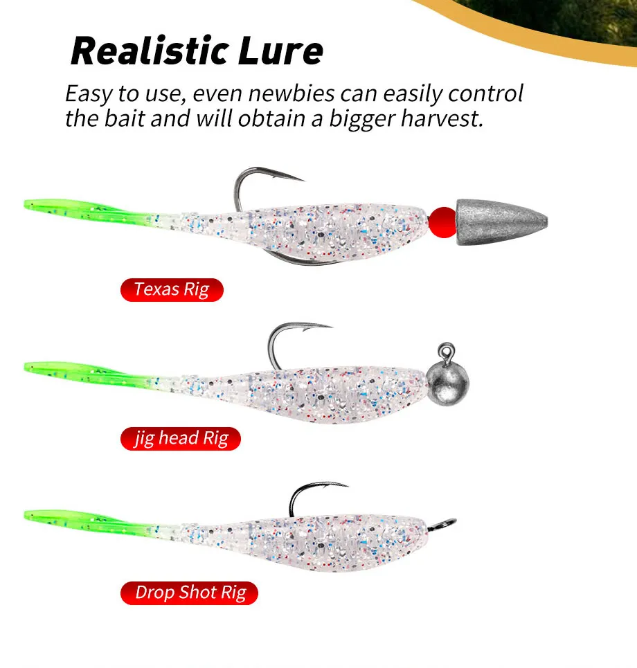 El señuelo suave proporciona una acción rápida y realista que imita el movimiento de natación del cebo común en un tamaño más pequeño.