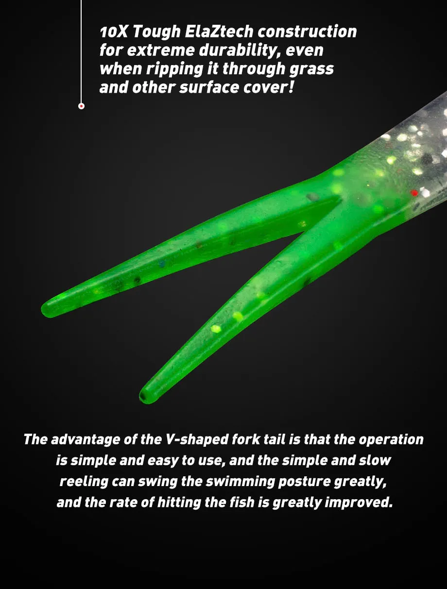 El señuelo es un cebo jerkbait de plástico suave que es perfecto para moverse alrededor de la hierba, educar peces o prácticamente en cualquier lugar. Es lo suficientemente pesado como para lanzar una larga distancia con o sin peso. También funciona bien en un equipo de Carolina o drop shot. Este es uno de esos cebos que simplemente no puede faltar.