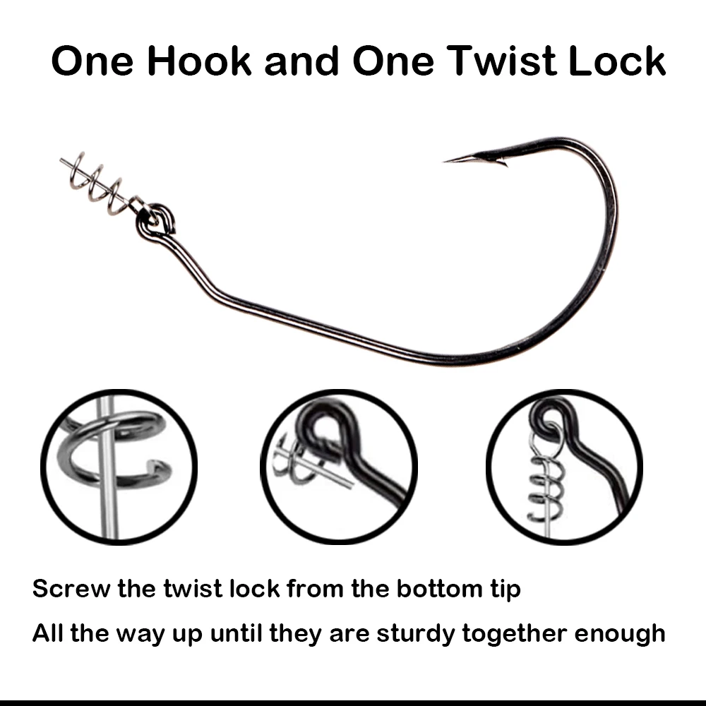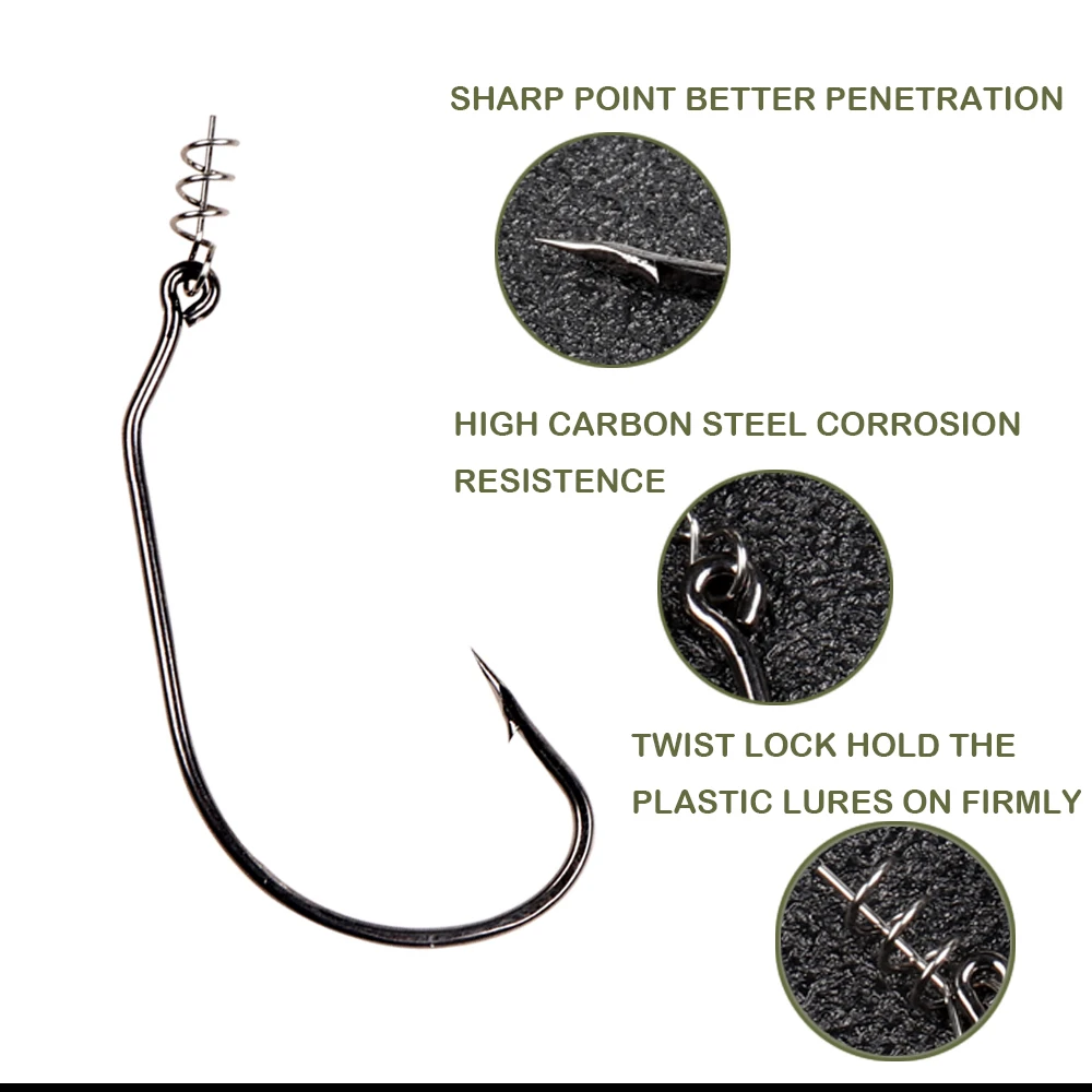 UNA GRAN OPCIÓN PARA UN BAÑO DE SEGURIDAD: con su casillero giratorio y resorte de pasador de centrado unido al ojo del anzuelo, los cebos se pueden asegurar permanentemente insertando el pasador en el centro de la punta de un plástico blando, que luego se puede atornillar. el resorte helicoidal del casillero Twist para montarlo perfectamente en todo momento.