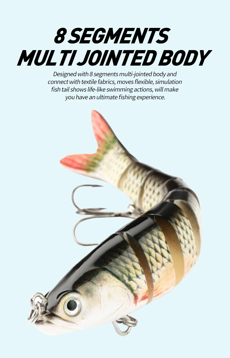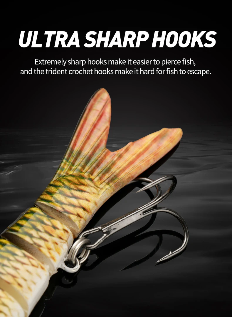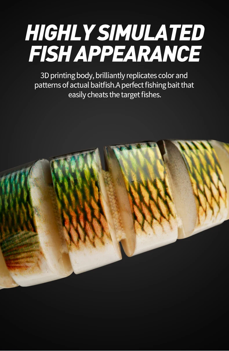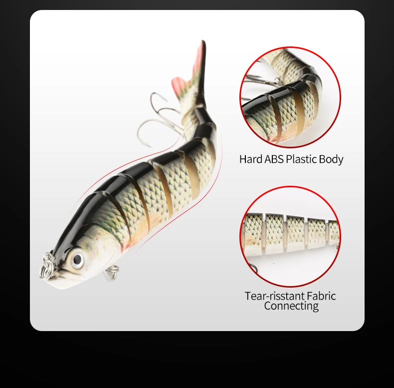 Señuelo realista de 6(8) segmentos-Diseñado con cuerpo multiarticulado de 6(8) segmentos, se mueve flexiblemente bajo el agua para lograr acciones de natación realistas, haciéndolo más atractivo para los peces depredadores.