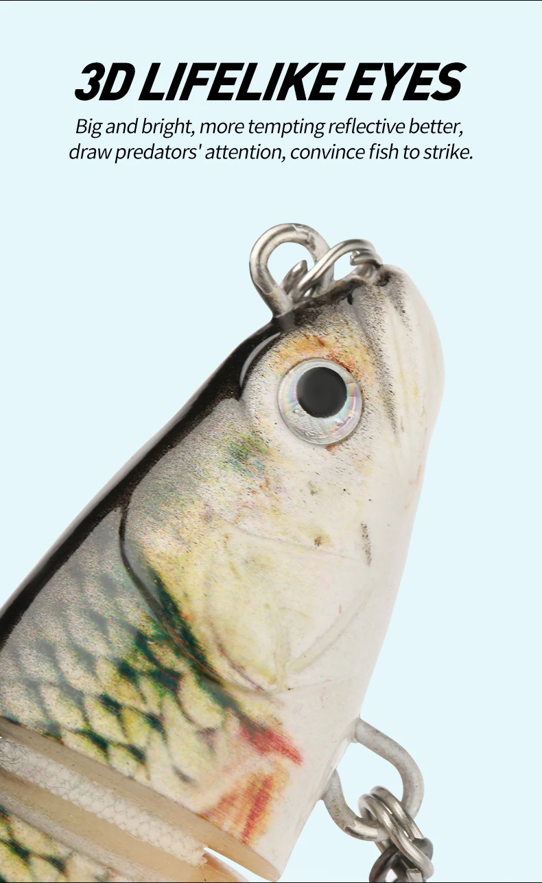 Alta simulación: gracias a los ojos de pez realistas en 3D y al recubrimiento simulado, el cebo de natación parece muy vívido como un pez real. Es un cebo perfecto que engaña fácilmente a los peces objetivo.