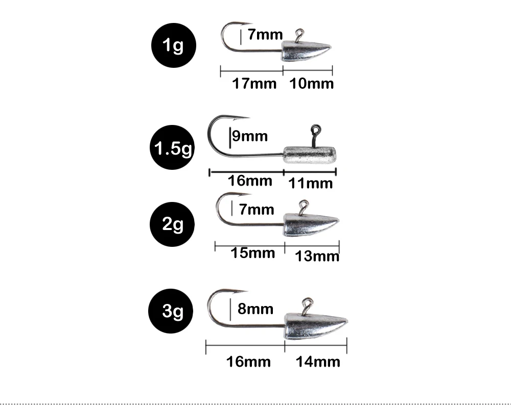Gancho de púas afilado químicamente: la cabeza de la plantilla de pesca tiene un diseño de cuerpo sólido y duradero de primera calidad.El anzuelo con punta es afilado, la durabilidad y la resistencia son mayores. El anzuelo afilado garantiza una mejor penetración, puede llevar el cebo al objetivo de manera efectiva.