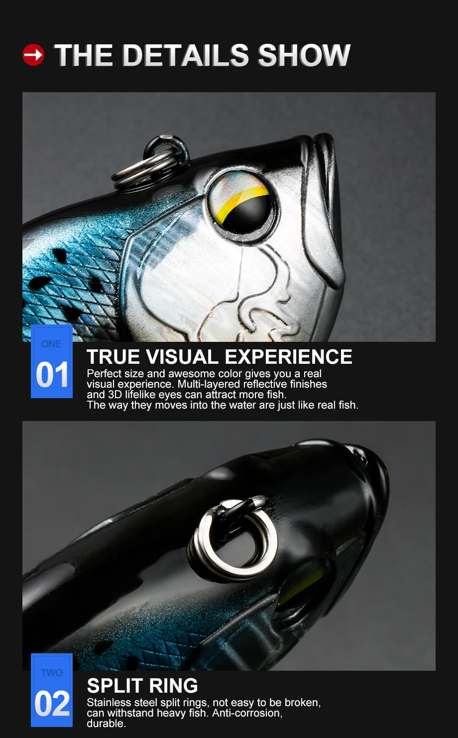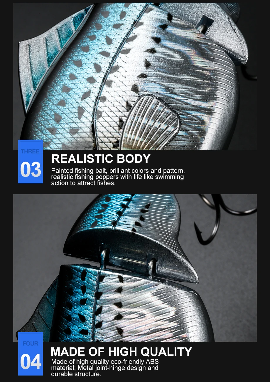 【Señuelos realistas 】diseñado con cuerpo de 2 segmentos, el señuelo de pesca puede hundirse lentamente y moverse flexible en el agua. Además, las acciones de natación realistas lo hacen atraer más capturas y provocar que los peces depredadores golpeen.【Alta simulación】con ojos de aspecto realista 3D y revestimiento de polvo de perla, este cebo de natación parece muy delicado y vívido que parece un pez real. Un cebo de pesca perfecto que atrapa fácilmente A los peces objetivo.【Vibración de graves 】hecho de material ABS de alta calidad, la Cámara de función sintonizada especial se cargó con bola de acero al lanzar el señuelo duro al agua, haciendo un sonido de traqueteo que atrae a los peces y los induce a golpear.【Amplias especias】 este señuelo de pesca de lubina puede ser ampliamente utilizado para atrapar lubina, perca amarilla, Lucio, Lucio, muskkie, cucaracha, trucha, snook. Salmón, etc. Este swimbait es bastante adecuado tanto para agua salada como para agua dulce y funciona bien en todas las capas de agua.