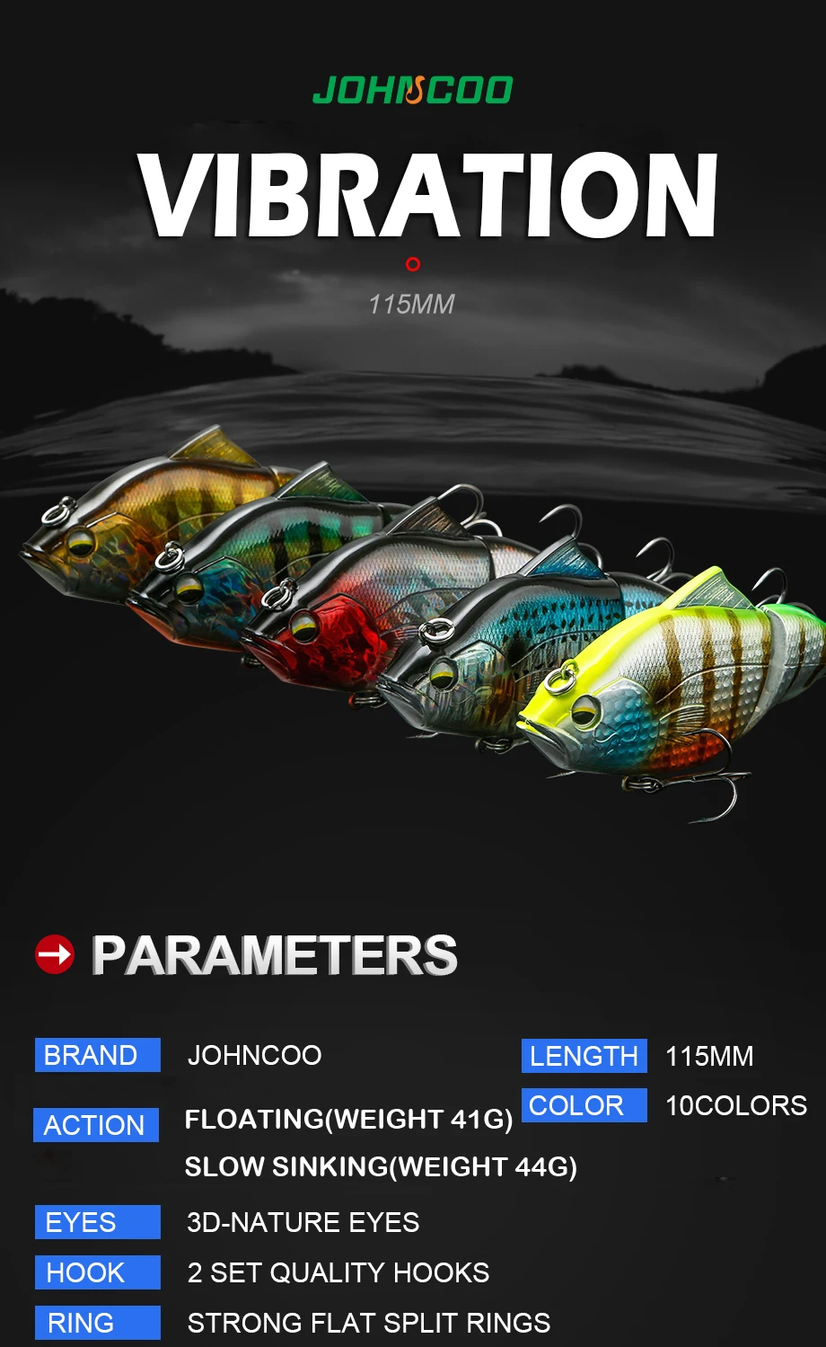 JOHNCOO 115mm 44g vibración SW señuelo de pesca sin brillo Crankbaits hundimiento lento plástico duro Artificial VIB Bait Bass Fishing