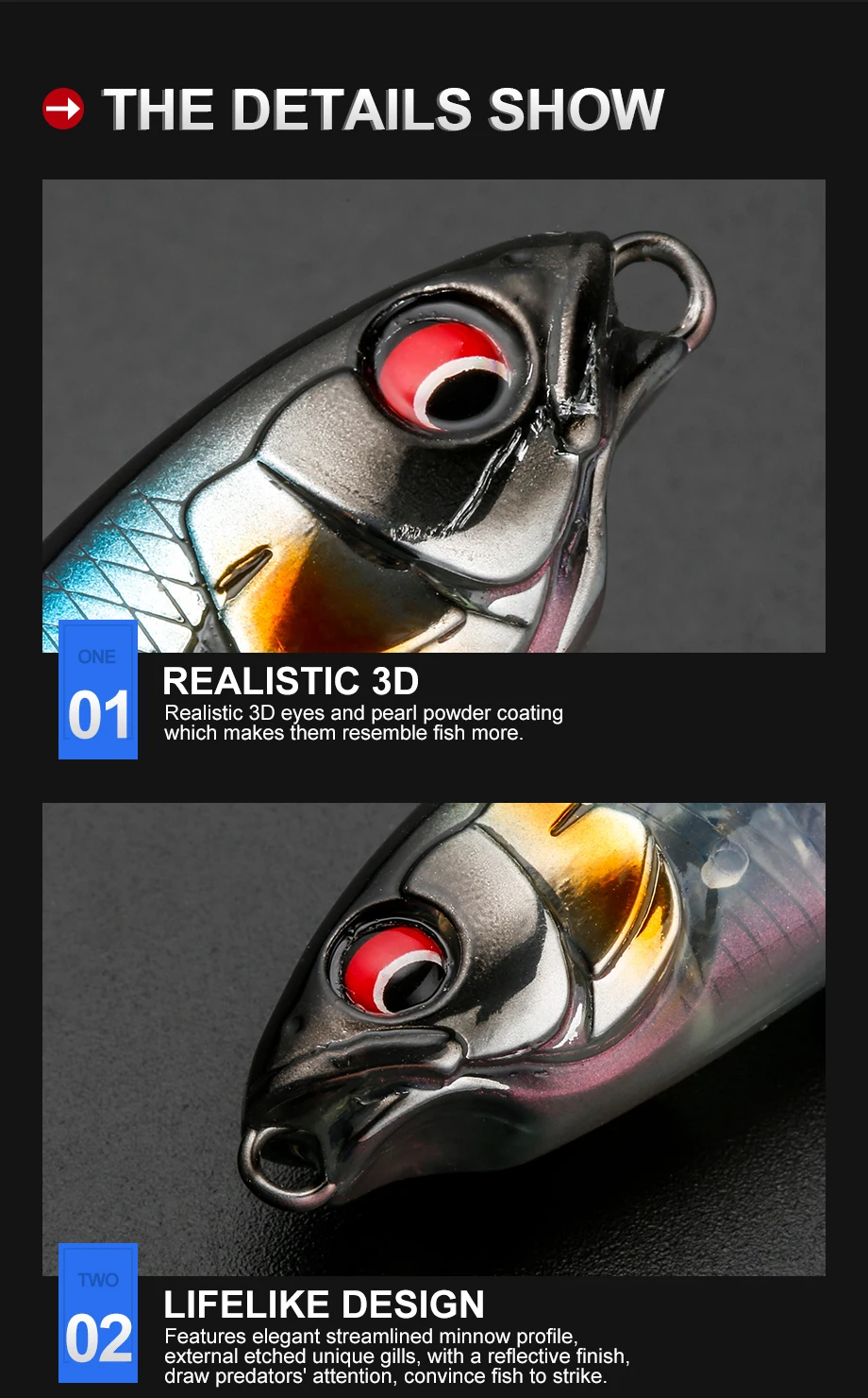 Diseño realista: presenta un elegante perfil de pececillo aerodinámico, ojos 3D realistas de 2 tonos, branquias únicas grabadas externamente, con un acabado reflectante, atrae la atención de los depredadores, convence a los peces de atacar.