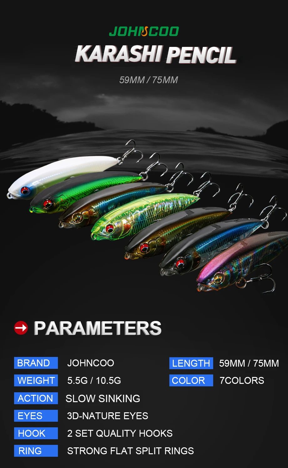 JOHNCOO lápiz señuelo de pesca hundimiento lento 59mm 75mm cebo de plástico duro Artificial trucha aparejos de lubina