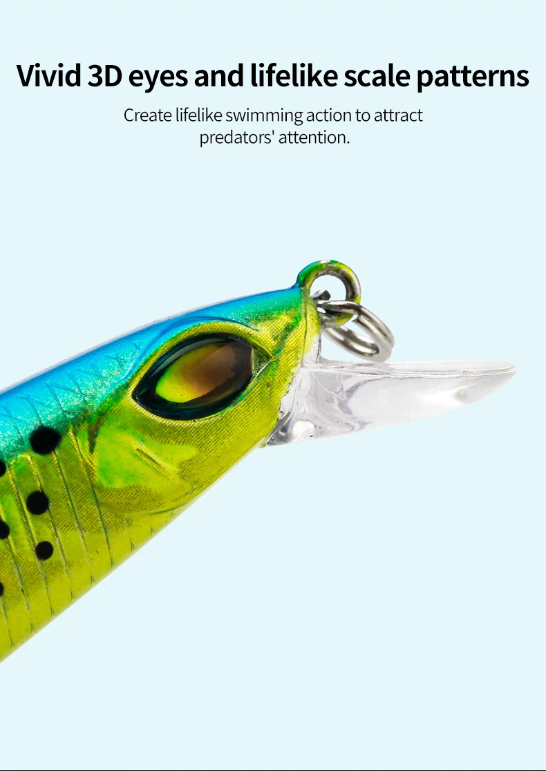 Los señuelos de lubina tienen una bola de gravedad incorporada para un lanzamiento largo y preciso y estabilidad postural y hacen algo de ruido para atraer la atención de los peces.