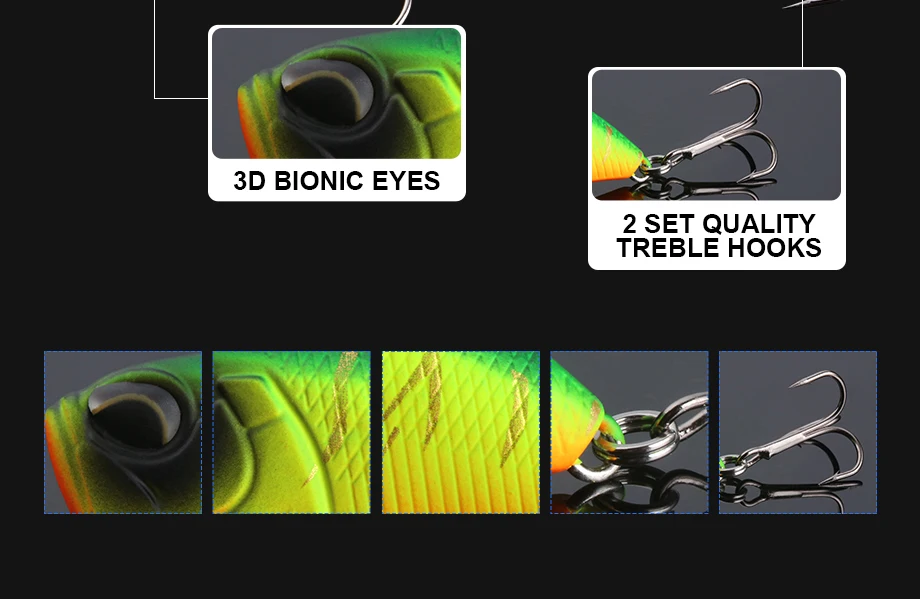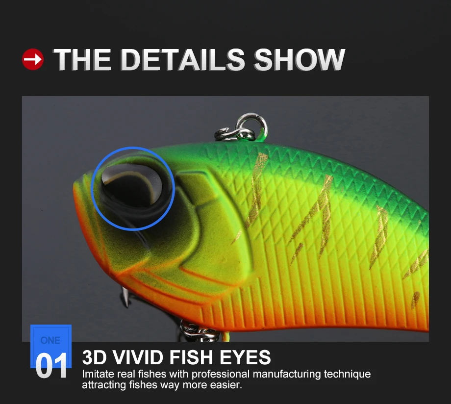 Ojos de pez vívidos 2.3D.Imita peces reales con una técnica de fabricación profesional, atrayendo peces mucho más fácilmente.3. Diseño de forma de vibración rápida.Ayuda a hundirse lentamente en el agua como un pez real nadando.4. Ganchos de bardo afilados. Nade en agua y coge peces con anzuelos afilados.