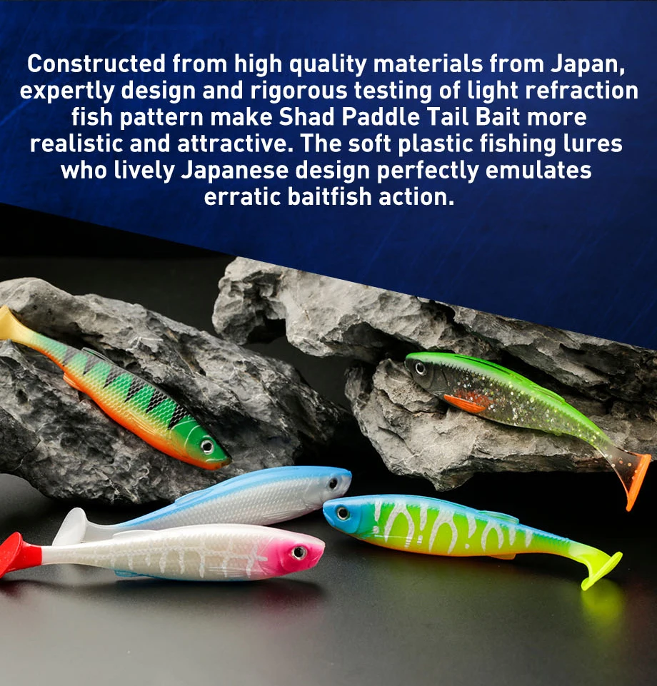 【FLEXIBLE Y DURABLECombinado con suavidad y dureza le permite ser más flexible, duradero, más suave y más resistente. La impregnación de sal le da una tasa de hundimiento ideal. Grandes remolques para Jigs. Pruebe el Swimbait de paleta Bombrooster para obtener el mayor éxito.