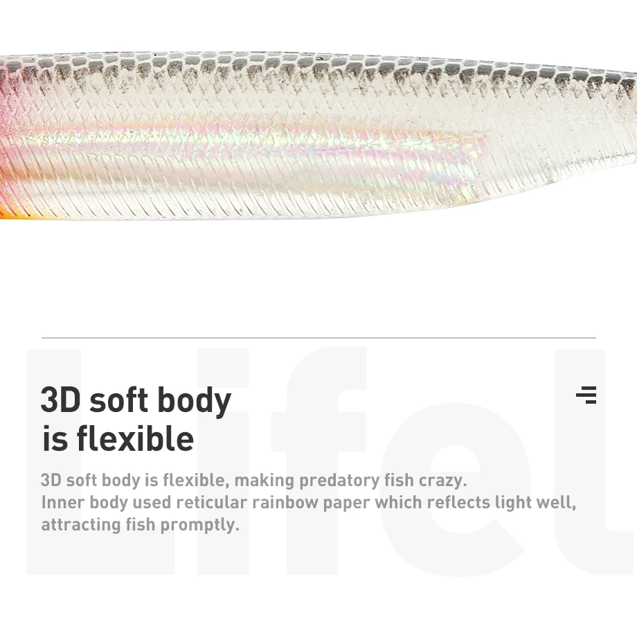 1.3D el cuerpo suave es flexible, haciendo que los peces depredadores sean locos. El cuerpo interno utiliza papel arcoíris reticular que refleja bien la luz, atrayendo a los peces rápidamente.