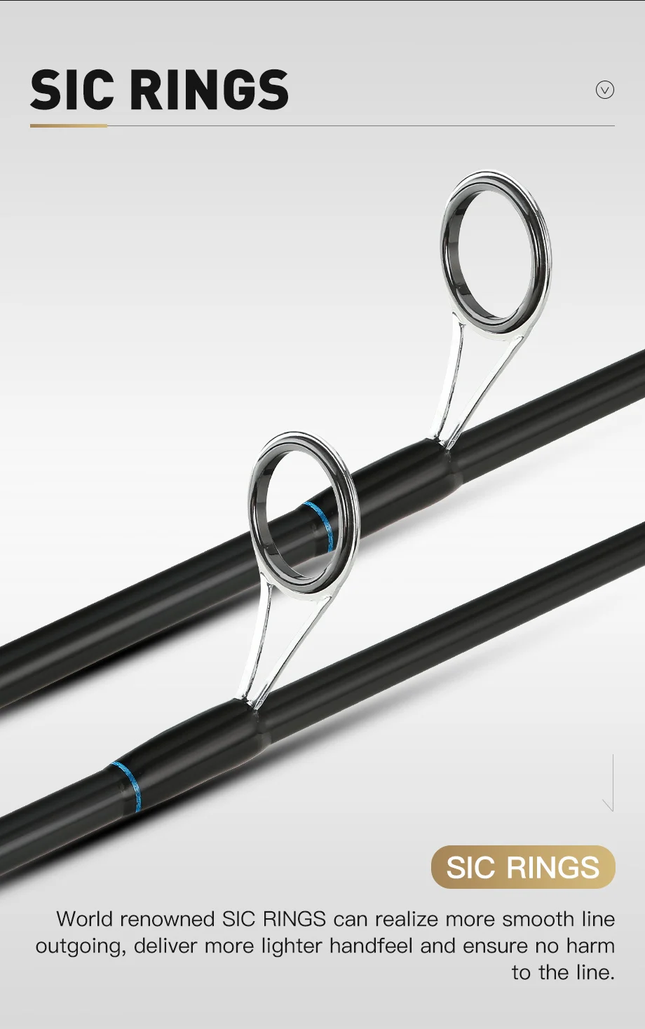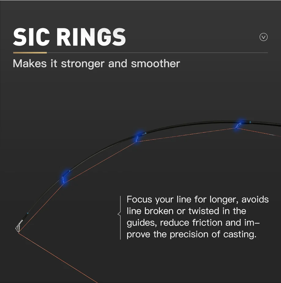 4. Las guías de acero inoxidable con inserciones de SiC lo hacen más suave y duradero, evita que la línea se pegue en las guías, minimiza la fricción al tiempo que mejora la sensibilidad transfiriendo vibraciones de la línea a través de la guía a la varilla y a su mano.