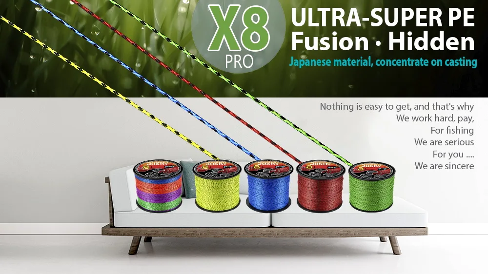 Línea de PE de 2, 8 hebras, material de Japón, construcción trenzada única, hecha de fibras de PE de resistencia ultraalta.