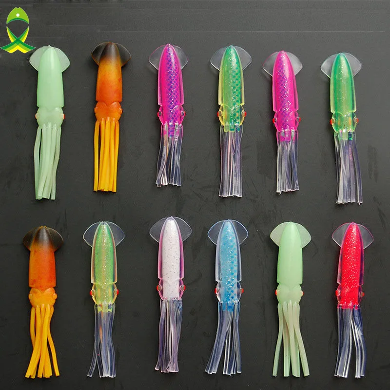 JSM 12 Uds. Señuelos de pesca de calamar suaves de 12cm para plantillas de colores mezclados gran juego pesca faldas de calamar luminosas cebo Artificial Jigging