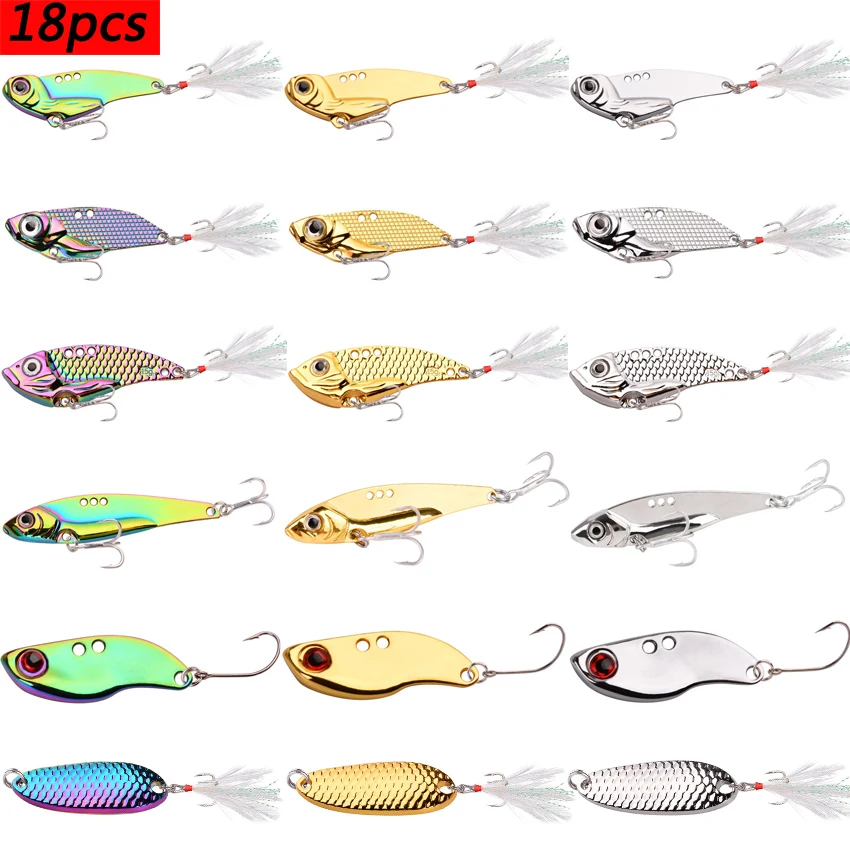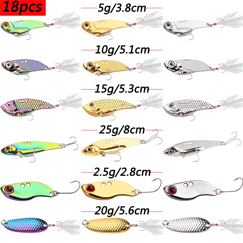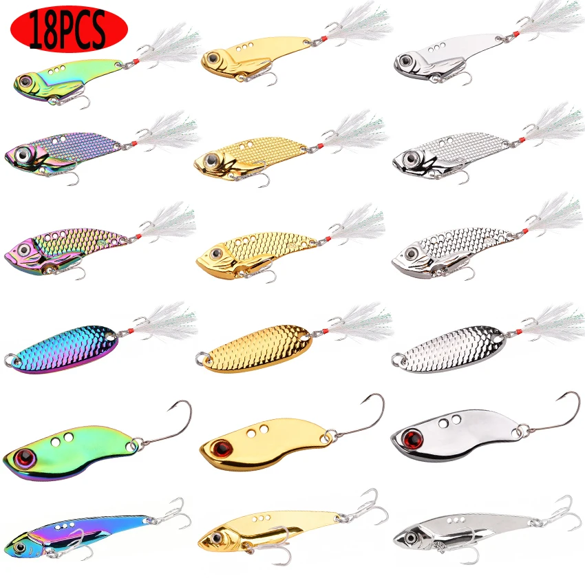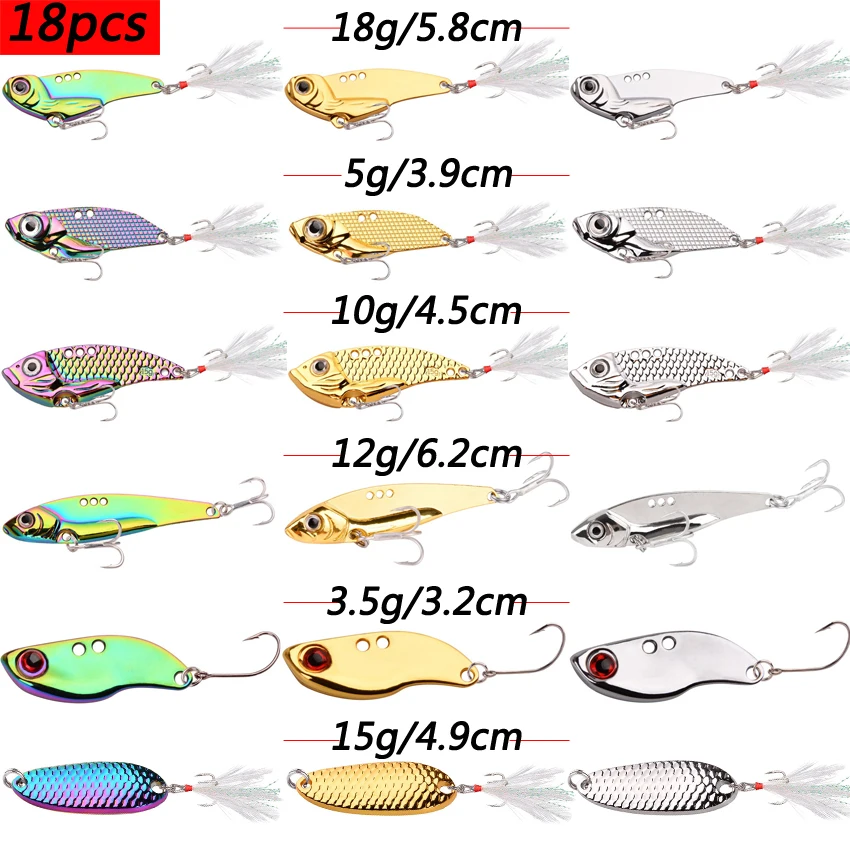 Juego de 18 piezas de peso mixto, señuelo de Pesca con lentejuelas de Metal, toda la capa de agua, lanzamiento largo, Vib Ration, lubina Artificial, cebo de Pesca para cebo tembloroso