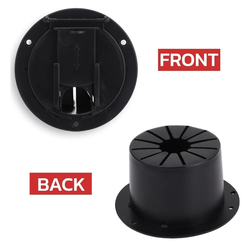 1. Trampillas de cable redondas con cubierta a presión, pantalla deslizante y bisagras resistentes para una mayor durabilidad, lo que garantiza la seguridad de sus cables.; diseñado para acomodar cables de alimentación de hasta 50 amperios, con un diámetro interior de aproximadamente 3,5 pulgadas y un diámetro exterior de aproximadamente 4,4 pulgadas