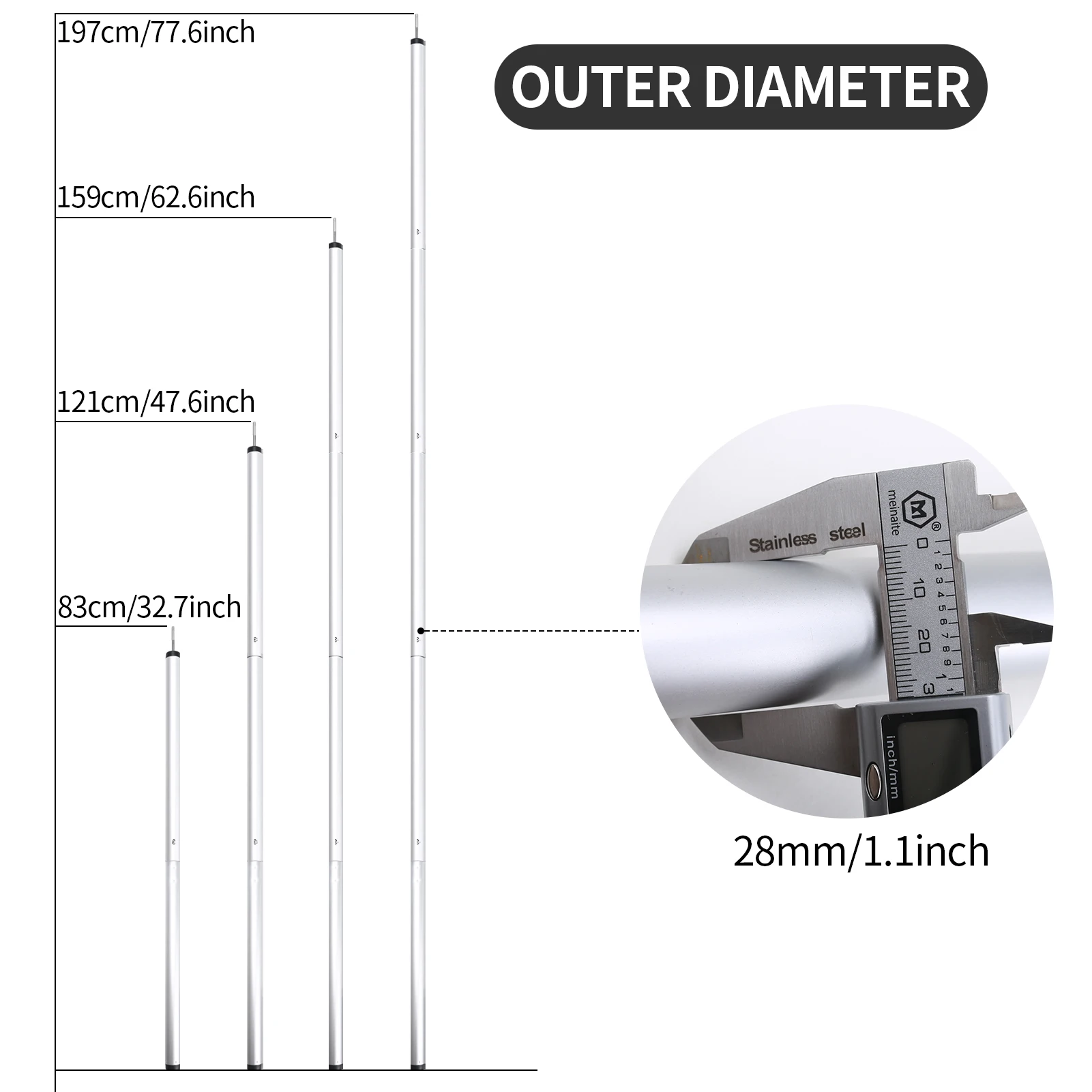 Ligero y portátil --¡El par completo de postes de lona pesa solo 1,64 kg! Tan ligero que ni siquiera sentirás su peso cuando estés de excursión. Nuestros postes de tienda livianos tienen la misma longitud de poste central, por lo que solo necesita llevar la cantidad de secciones que necesita cuando está fuera para reducir el peso.