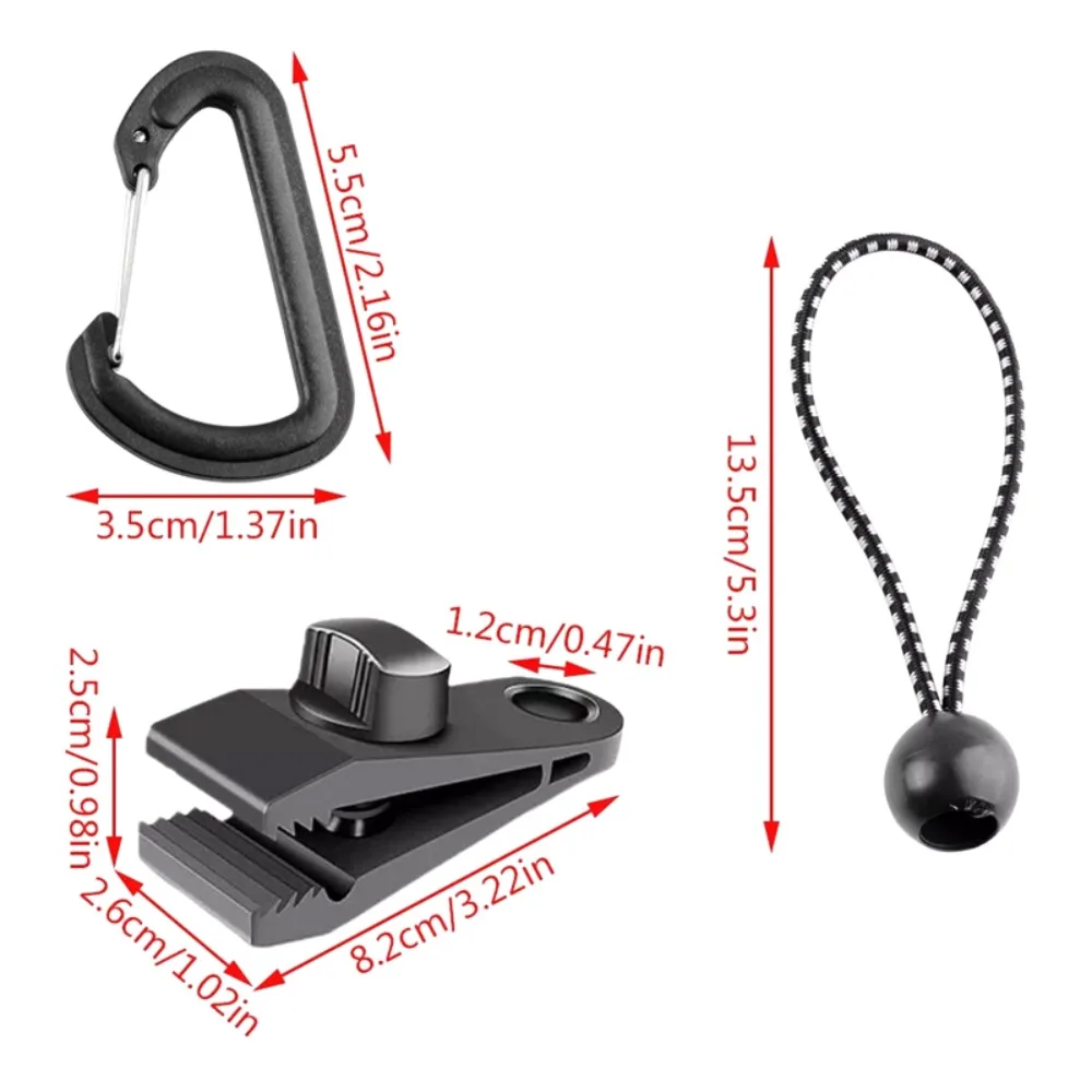 Includes 10pcs heavy duty tarp clips, 10pcs bungee ball cords and 10pcs carabiners, which are practical outdoor camping tools.
