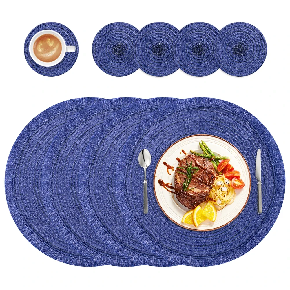 Material: Mantel individual fabricado en resina de poliéster, hecho a mano y duradero.El diámetro de 14 pulgadas es lo suficientemente grande para cualquier plato o tazón. Paquete de 4 juegos: 4 manteles individuales (14 pulgadas/35 cm) y 4 posavasos (4,1 pulgadas/10,5 cm). Uso: Estos hermosos manteles individuales trenzados son excelentes para proteger su mesa de derrames y manchas, son resistentes al calor, brindan colores vivos y un aspecto moderno para animar su mesa de comedor. Fácil limpieza: limpie las manchas con un paño húmedo.No lavar a máquina ni a mano. Ocasiones: Perfecto para uso diario, tanto en interiores como en exteriores. Comedor, cocina, granja, restaurantes, hoteles o cafeterías. Navidad, Acción de Gracias, reuniones familiares, cumpleaños, vacaciones, fiestas, bodas, barbacoas y más.