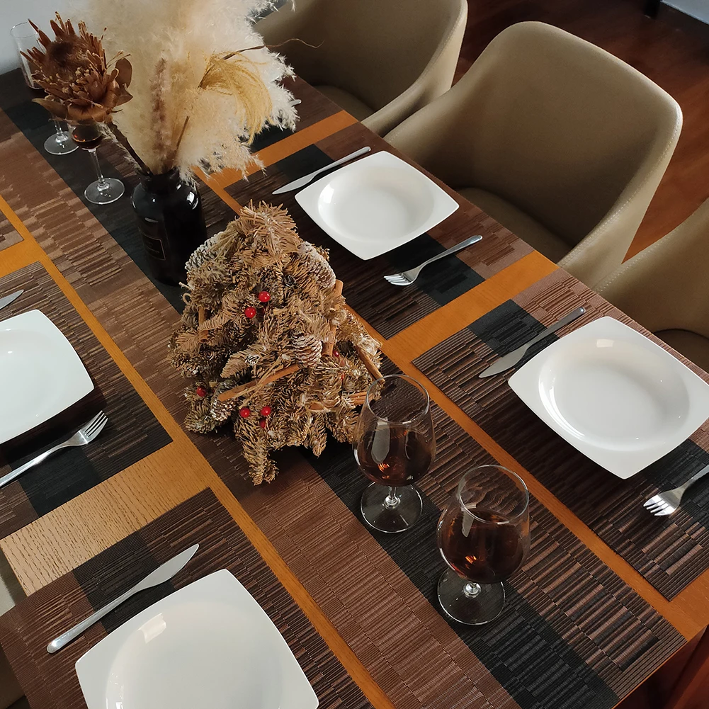 -- El juego de 6 manteles individuales y posavasos puede ser la decoración y calidad de vida perfecta para su hogar, restaurante, cocina, hotel y oficina comercial.Ideal para usar con mesas de madera oscura, mesas de vidrio, mesas de comedor blancas, mesas de madera de granja, mesas de comedor marrones.
