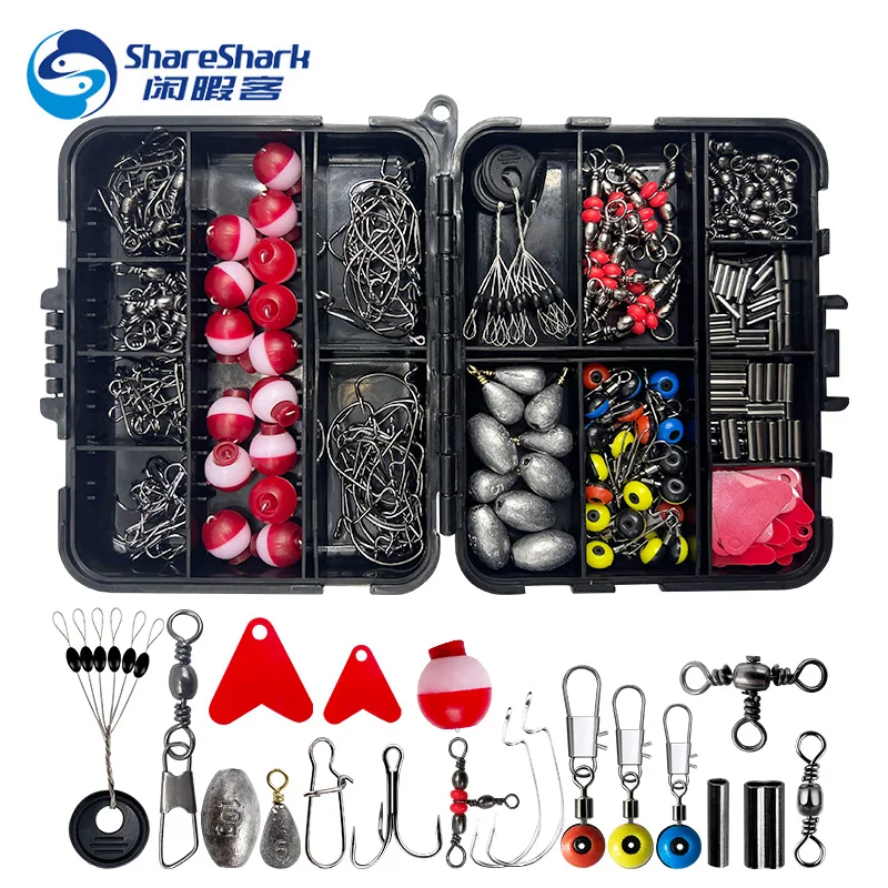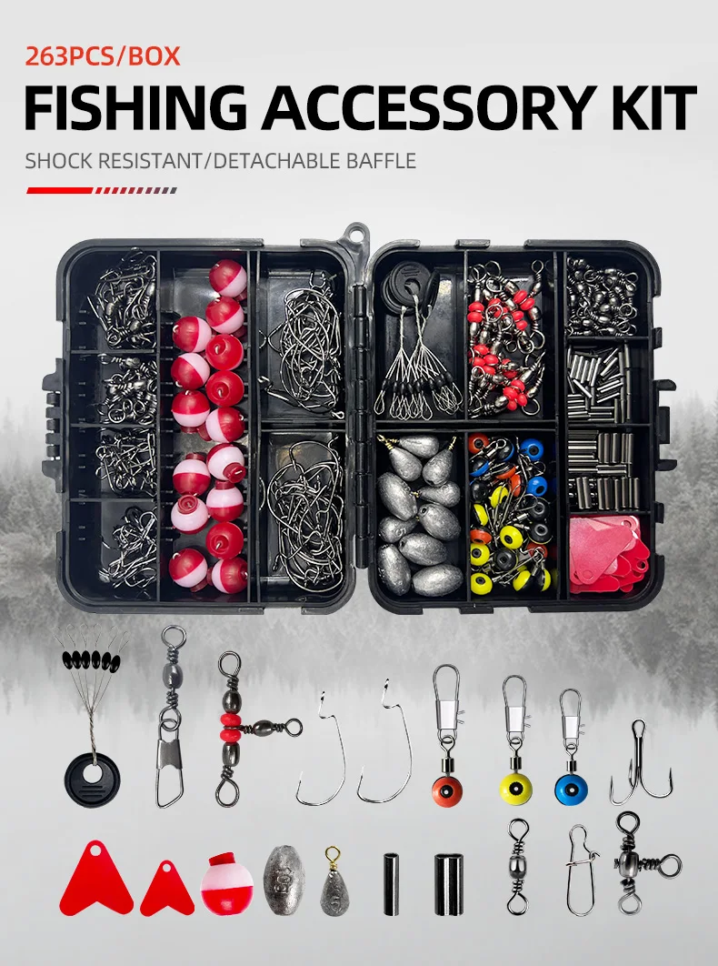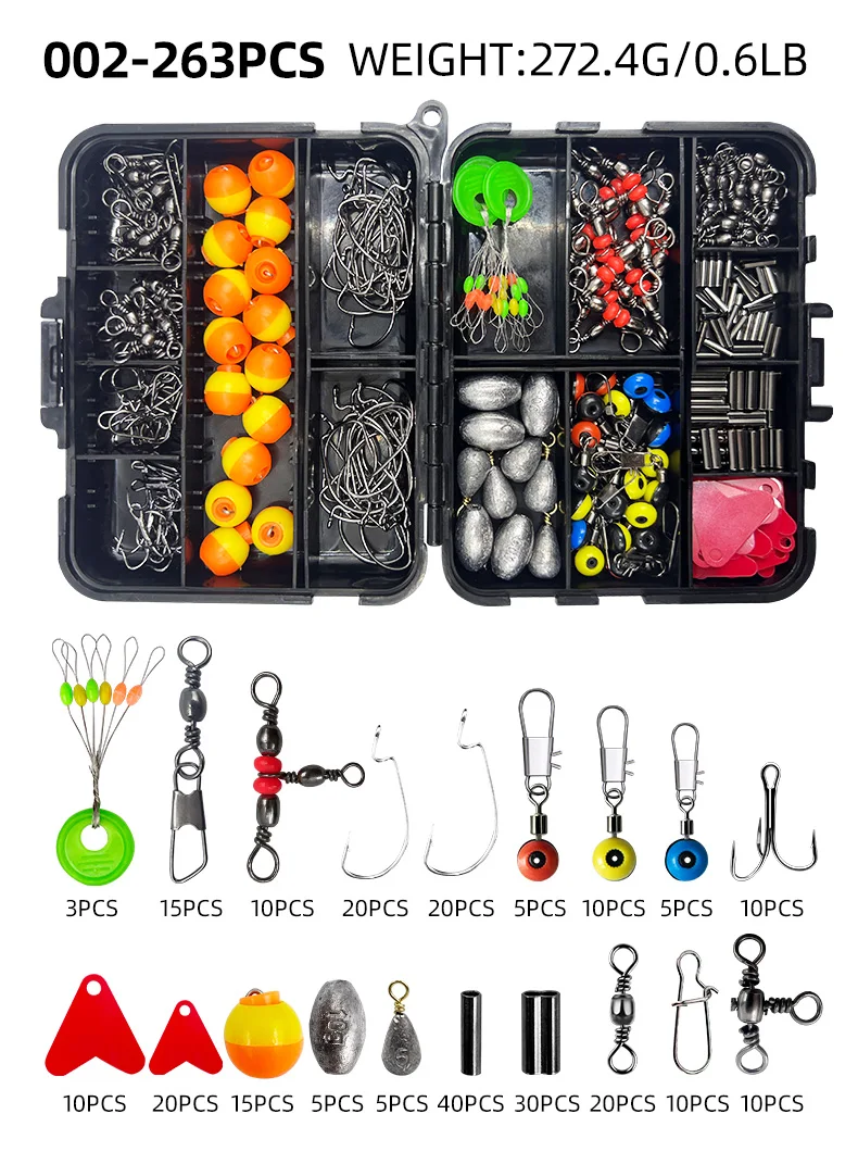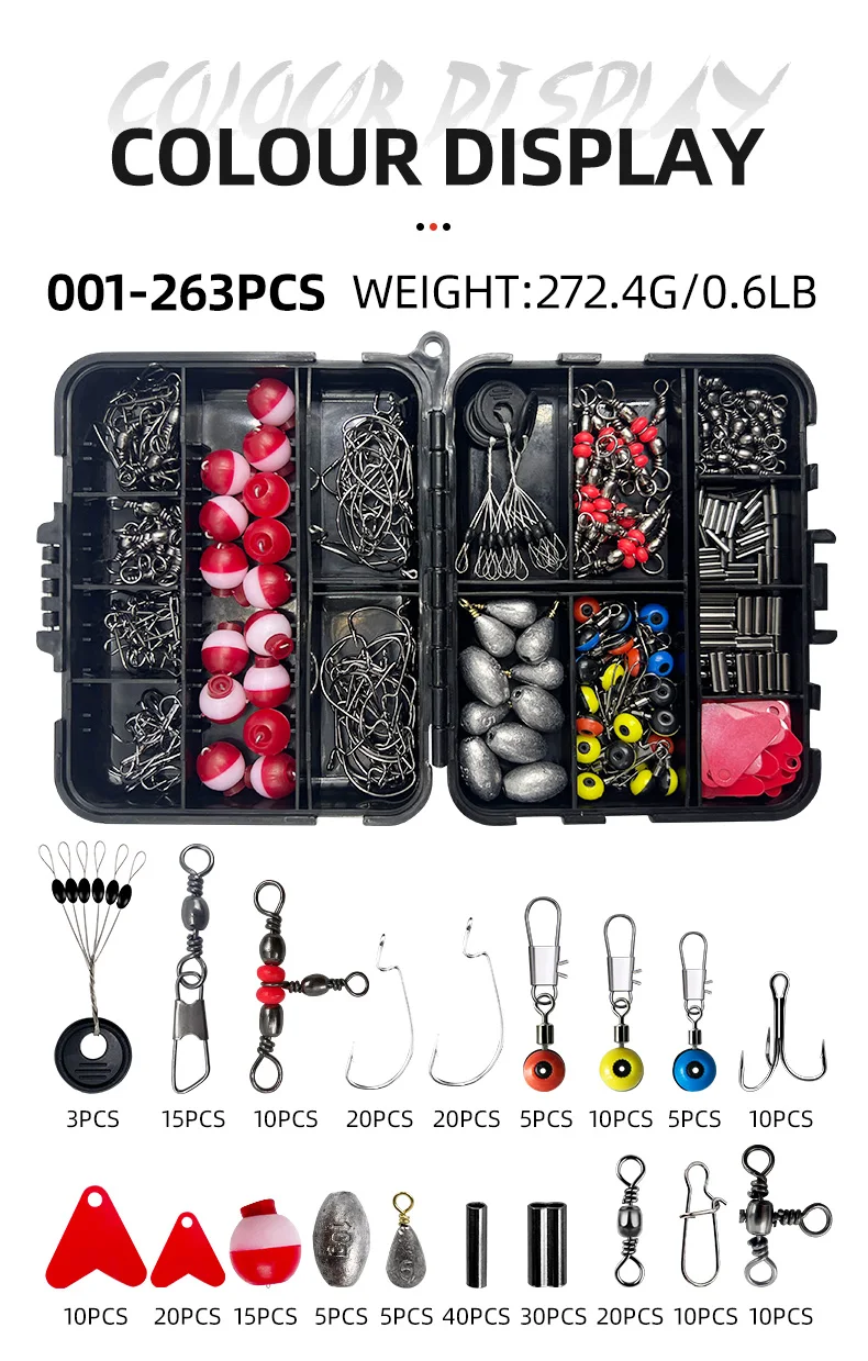 Juego de accesorios de pesca de 263 piezas, gancho de manivela flotante esférico, anillo giratorio, señuelo de plomada, conjunto de aparejos de pesca, herramienta【Material superior】: Giratorio de cambio rápido: acero inoxidable, con buena resistencia al óxido y la corrosión.Clip de plomo de plástico: plástico de alta calidad, difícil de romper.