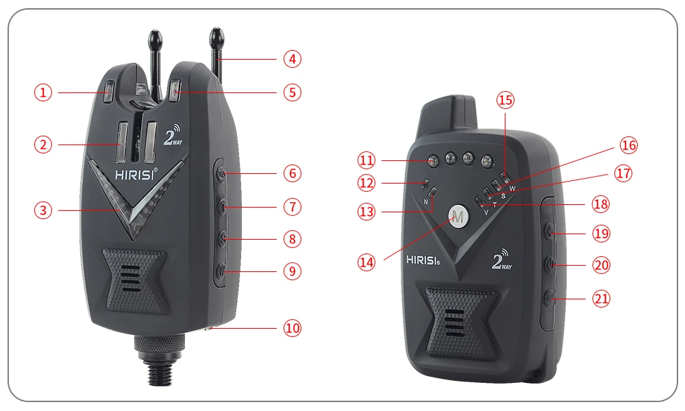 Presione el botón en el receptor para controlar la alarma de pesca, para ajustar su volumen, tono, sensibilidad, luz nocturna y función antirrobo.