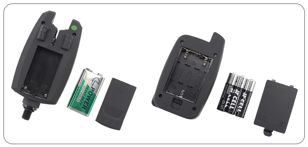 - La alarma de pesca requiere 1 pila de 9 V, el receptor requiere 3 pilas AAA.