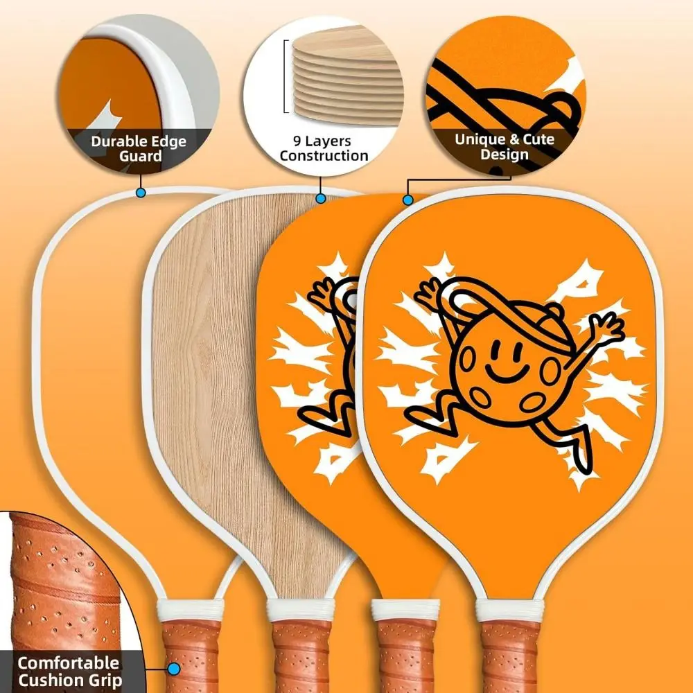 Material: madera Color: como se muestra Pickleball Tamaño de la paleta: 39*19*1,3 cm (15,35*7,48*0.512in) Pickleball tamaño de la bola: 7,2*7,2 cm/2,83*2.83in Características: fácil de llevar, antideslizante, ligero. El paquete incluye: 4 raquetas Pickleball, 4 bolas Pickleball, 1 bolsa de transporte. Gran juego de Pickleball: el juego de Pickleball incluye 4 raquetas de pickleball de madera Premium, 4 bolas y 1 bolsa de transporte. 2. Paletas Pickleball premium: hechas de tilo de calidad de 9 capas, lo que hace que la paleta Pickleball sea más fuerte y duradera, proporcionándote un impulso de potencia para cada golpe, lo que te permite controlar tus disparos con mayor potencia. 3. Agarre cómodo: La raqueta Pickleball tiene un agarre roscado acolchado, absorbe los golpes, es resistente al sudor, durante el uso reduce el deslizamiento, te hace más diestro y cómodo al balancear y golpear la pelota, no se cansa fácilmente incluso después de largos golpes. 4. Regalo Pickleball perfecto para: este juego de Pickleball es adecuado para todas las edades y todos los niveles de habilidad, es el regalo perfecto para los entusiastas del deporte, esta paleta de Pickleball atiende desde principiantes hasta profesionales.
