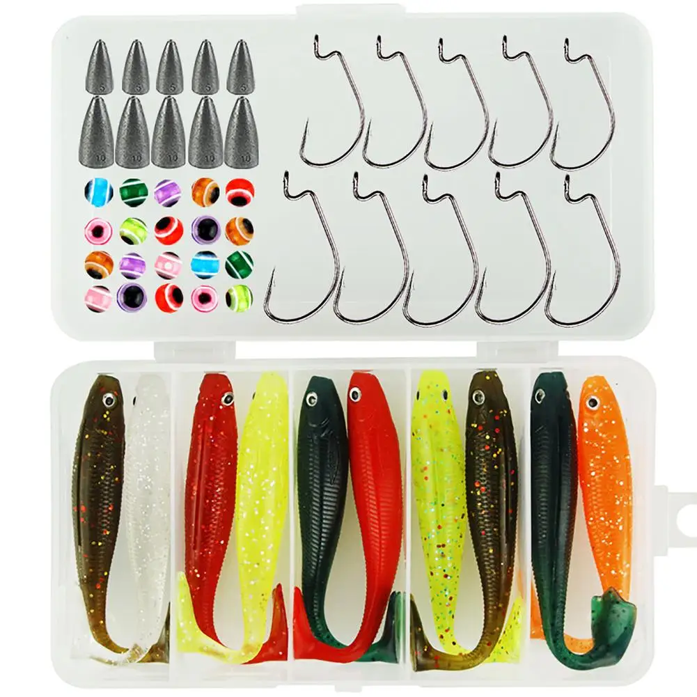 Juego de anzuelo de pesca de 50 piezas, cebo blando de cola en T, anzuelo de lanzamiento largo, accesorios de pesca para agua dulce de agua salada