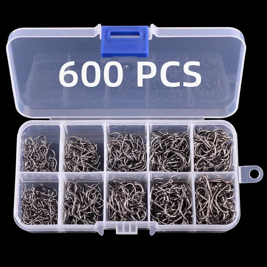 Juego de anzuelos de pesca de 7/100/200/300/400/500 piezas, anzuelos de púas de acero de alto carbono para equipo de pesca de agua dulce y salada