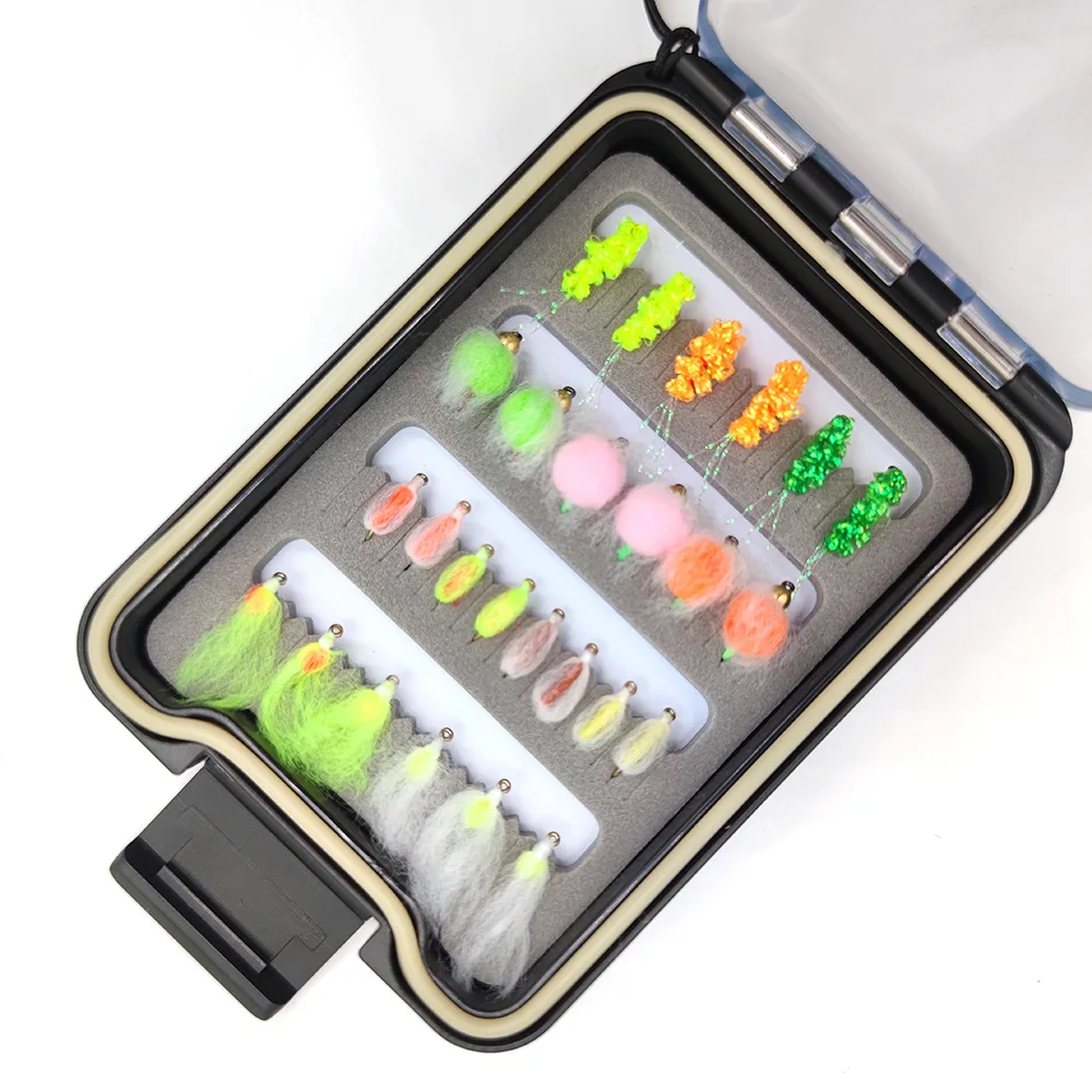 La mayoría de las moscas incluidas en este kit son perfectas para apuntar a la trucha, mientras que la pata de goma Copper John es para trucha y Steelhead, y el objetivo de succión de huevos Crystal Leech para Steelhead y Salmon.