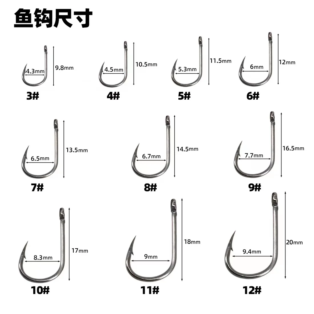 1. Múltiples tamaños: 10 tamaños diferentes (#3 a #112) para adaptarse a sus múltiples aplicaciones de pesca que garantizan que el placer de la pesca continúe.