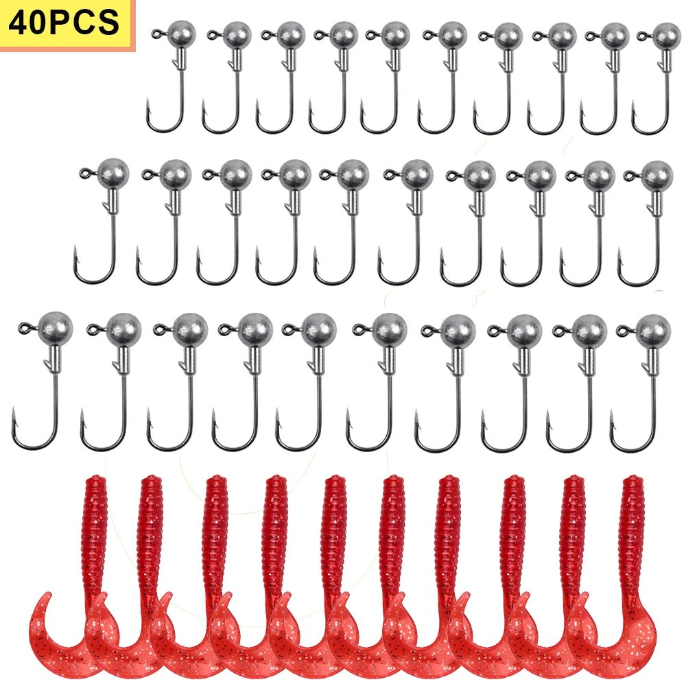 40 piezas de cabezales de plomo, ganchos de pesca, juego de señuelos de gusano blando de agua salada, cebo Artificial para anzuelos de Bajo crappie, Kit de aparejos de pesca