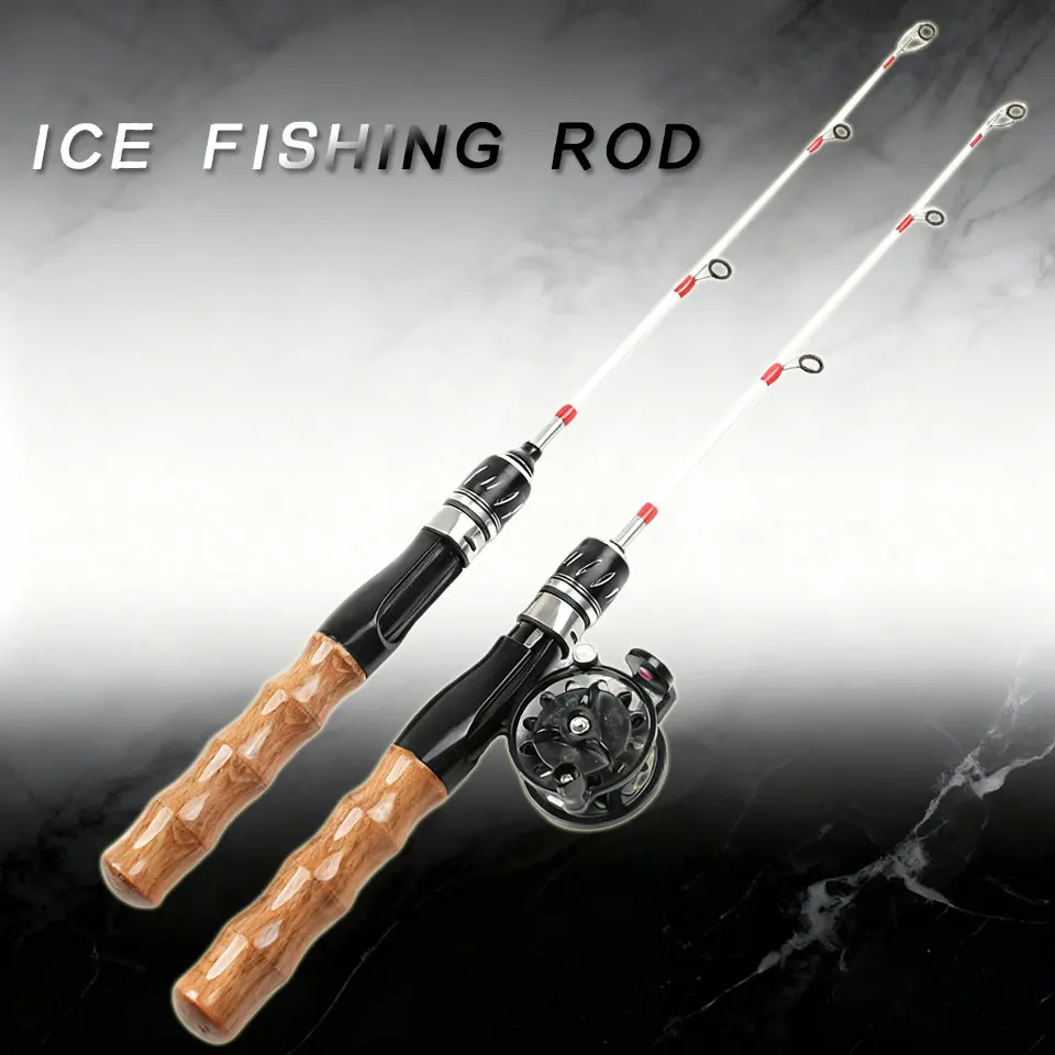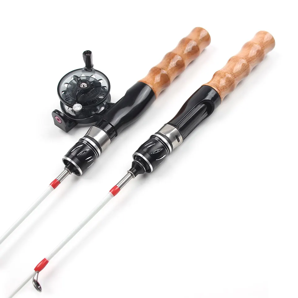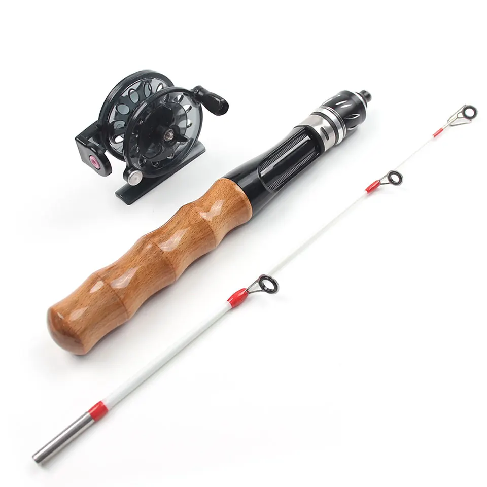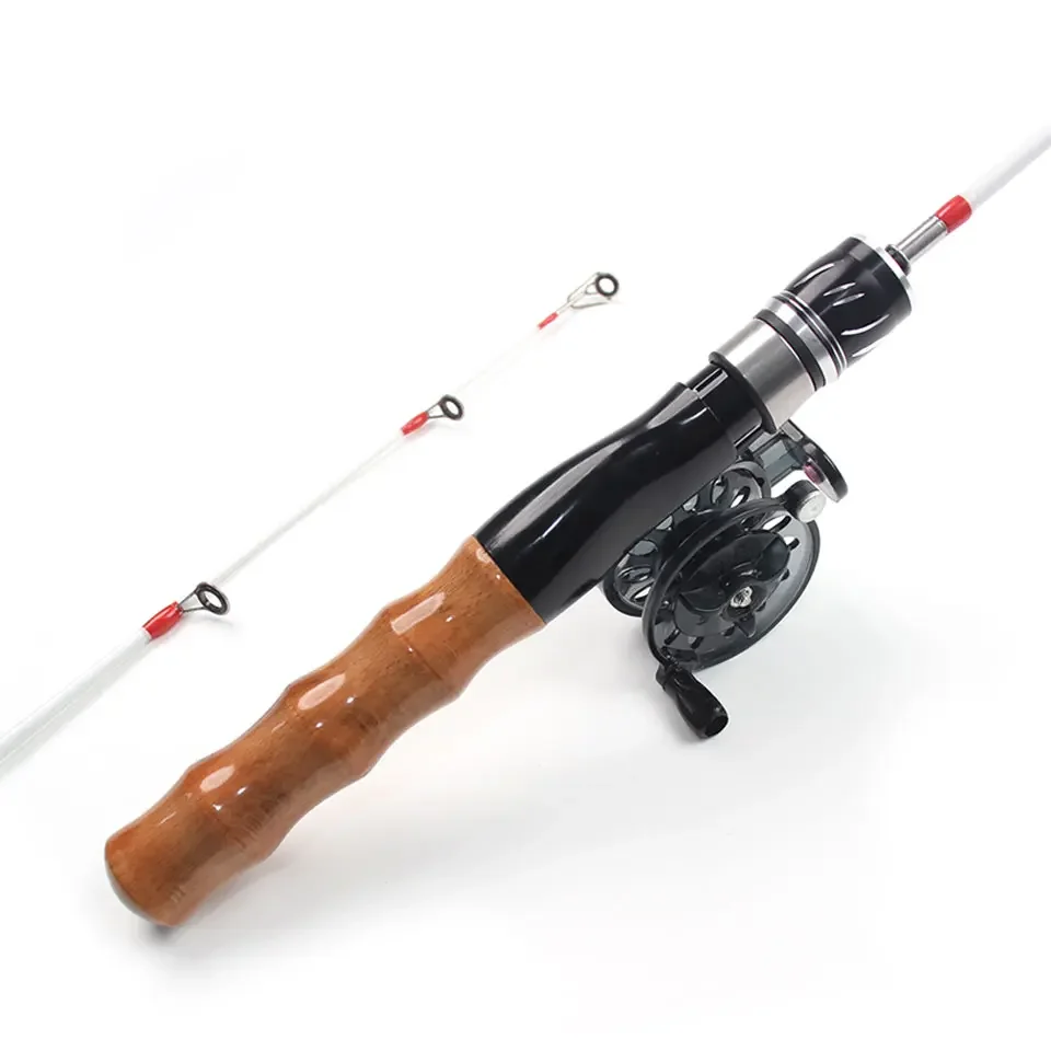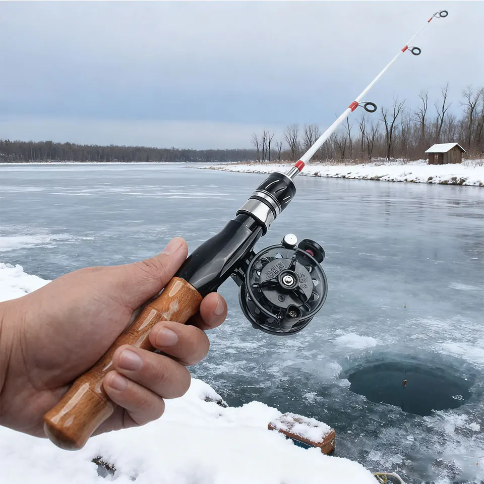Juego de caña y carrete de pesca en hielo; la caña es compacta, ofrece excelente manejo y permite iniciar la pesca en cualquier momento.