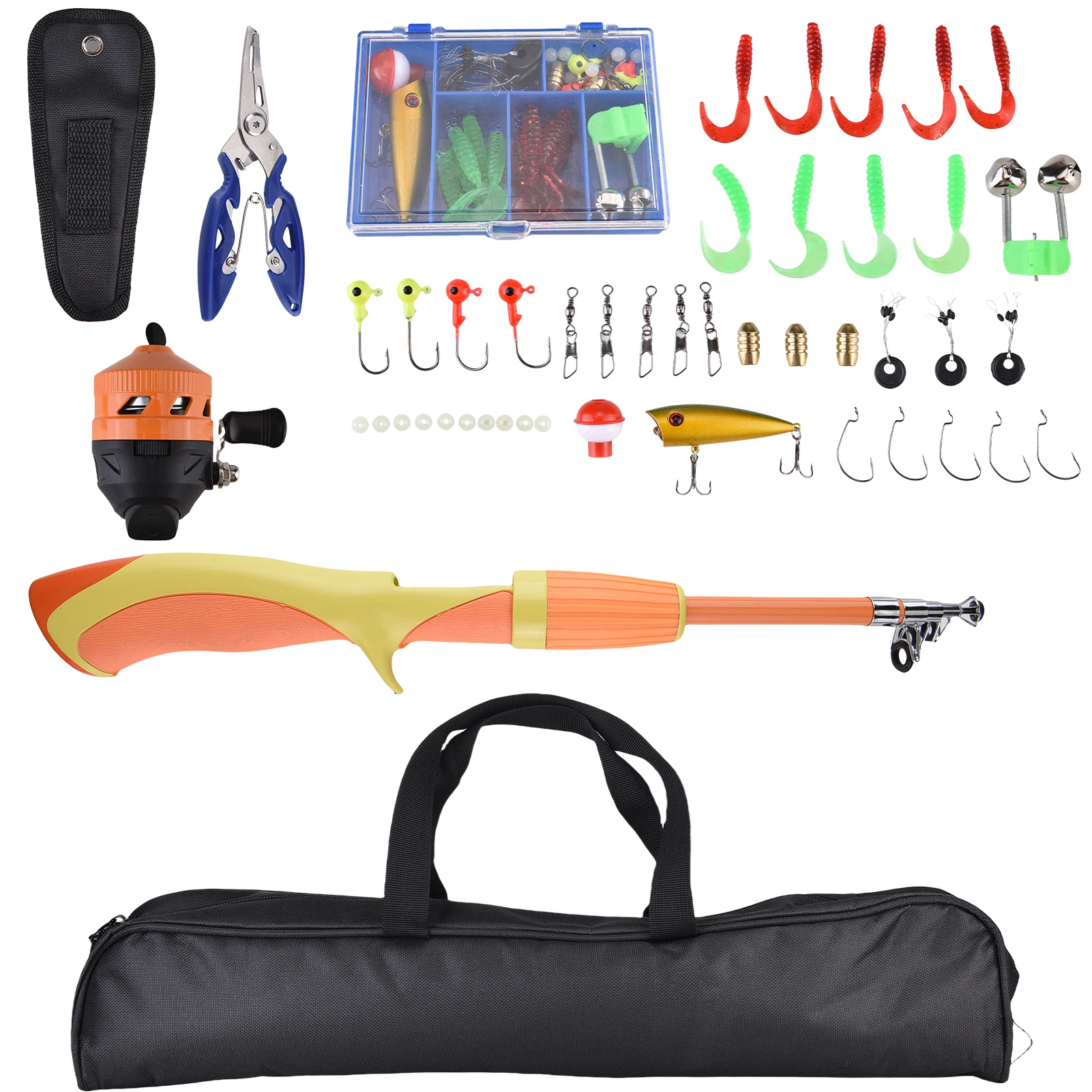 1. Complete Fishing Essentials: This kids fishing kit comes with a telescopic fishing rod, fishing reel, fishing hook, fishing lures, fishing pliers, barrel swivels, jig heads hook, space bean, copper sinker, bell, storage case, and travel bag, providing everything you need to get started.Specification:
