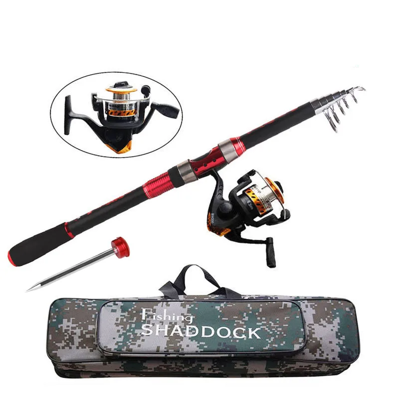 Juego de carrete y caña de pescar con carrete giratorio y caña de pescar telescópica de 2,1 m, Combo con bolsas, aparejos de pesca