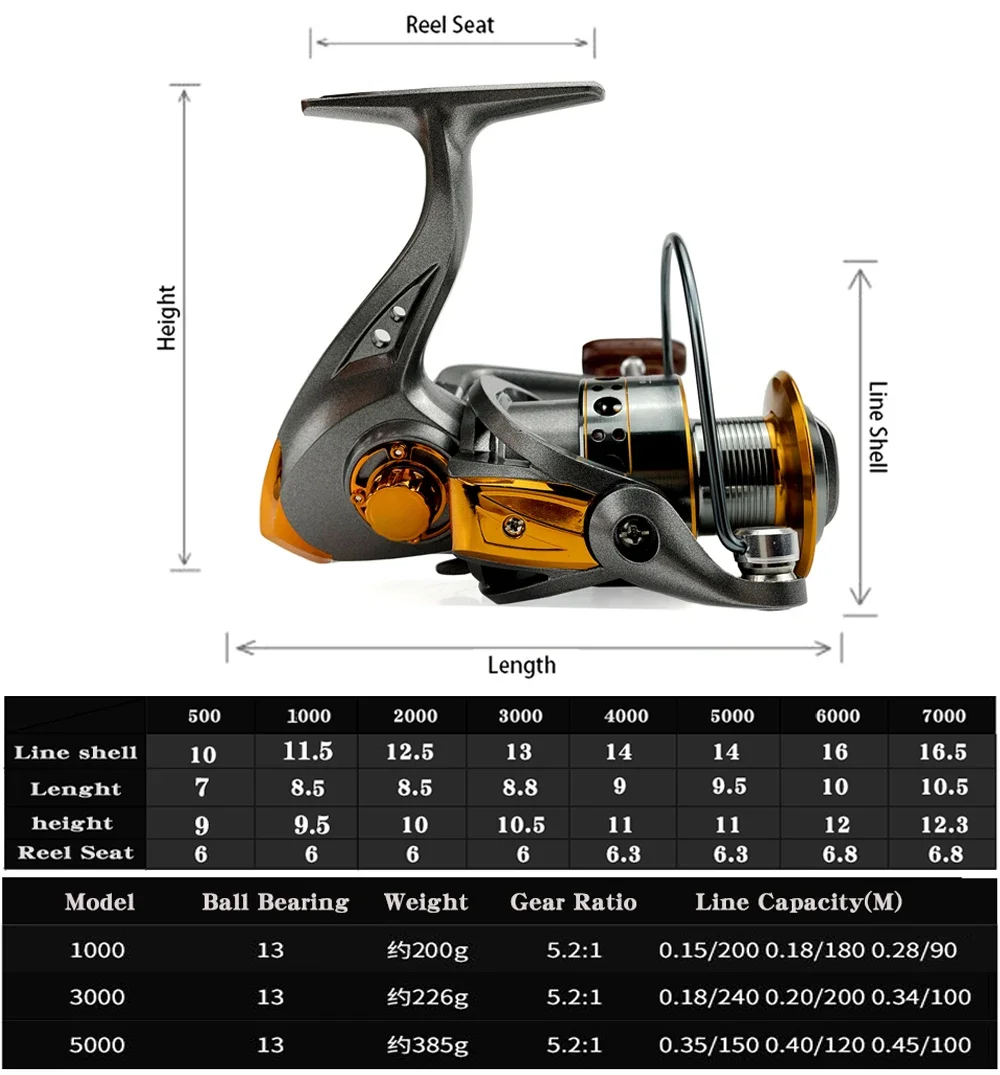 2,1 M Varilla + 1000 CarreteVarilla 2,4 M + carrete 30002,7 M Varilla + 3000 CarreteVarilla 3,0 M + carrete 50003,6 M Varilla + 5000 CarreteLa varilla:Secciones: 5 6 6 7 7Longitud: 2,1 m 2,4 m 2,7 m 3,0 M 3,6 mPeso: 140g 187g 193G 265G 271GLongitud cercana: 58cm 58cm 58cm 59cm 59cmEl carrete:Modelo: DC 1000 3000 5000Relación de engranajes: 5,2: 1Carrete: MetalCuerpo: plásticoBrazo de roca: plegable, izquierda y derecha intercambiables