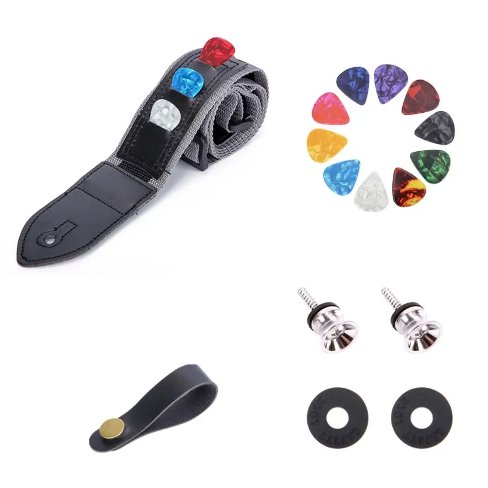 Tipo: Juego de correa de guitarra Tamaño: como se muestra Color: negro y gris Material: fibra de algodón, cuero de PU El paquete incluye: 1 correa de guitarra, 1 botón de correa, 2 cierres de correa de goma de la piezas, 2 clavos de correa de 1/2 "y 10" púas "de 1/2" cómodos y ajustables: longitud de la correa de guitarra de 83 a 130cm (51,18 pulgadas) ajustable-adecuado para hombres, mujeres y niños guitarristas. La correa de fibra de algodón y los extremos de cuero evitarán la tensión en el hombro o la espalda y eliminarán la incomodidad del sudor. Universal y duradero: Esta correa de guitarra universal es perfecta para su guitarra clásica, guitarra acústica, guitarra eléctrica o bajo. Se adapta a diferentes tipos de guitarristas, esta correa de guitarra colgante garantiza una sujeción segura de su instrumento. La correa de la guitarra viene con un botón de Correa y un par de cierres de Correa y 10 púas de guitarra. Ideal para estudiantes de guitarra y músicos. El botón de la correa se ve muy bien y se sujetará y sujetará de forma segura, no dañará el acabado de su instrumento. Los cierres de correa bloquearán su correa en segundos. Las púas de guitarra ofrecerán un tono de música cálido y redondo. Fácil de usar y le encantará al guitarrista. Este Paquete de correas de guitarra brindará a los instrumentistas un rendimiento cómodo y elegante.