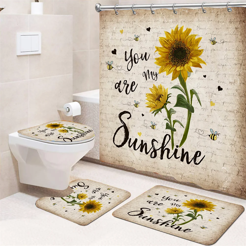 🌻[MATERIAL PREMIUM]: Este juego de cortinas de ducha de girasol está hecho de poliéster, que es impermeable y cómodo.La alfombra de baño antideslizante/alfombra tipo U está hecha de esponja, franela de alta calidad y parte inferior antideslizante, con súper absorción y secado rápido.