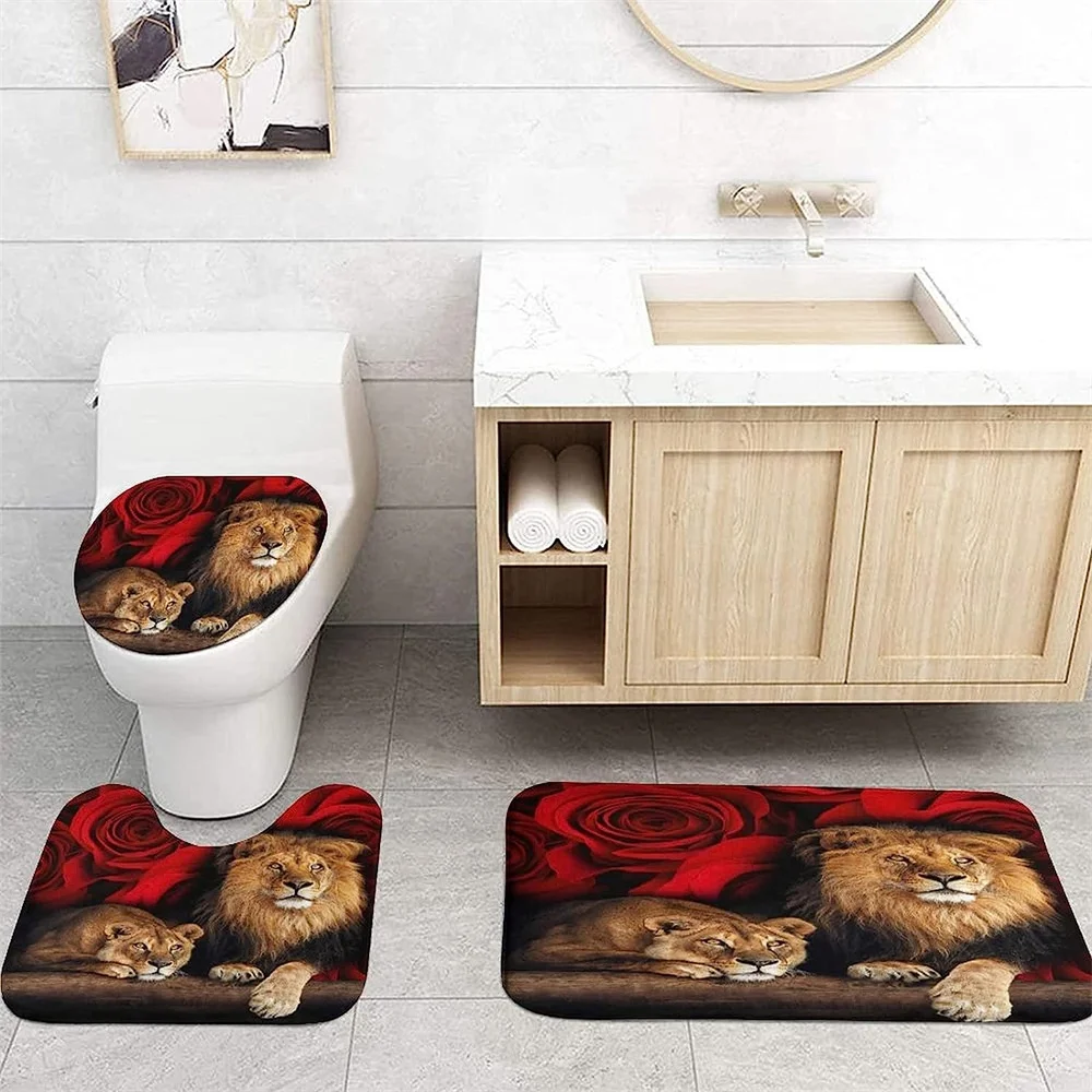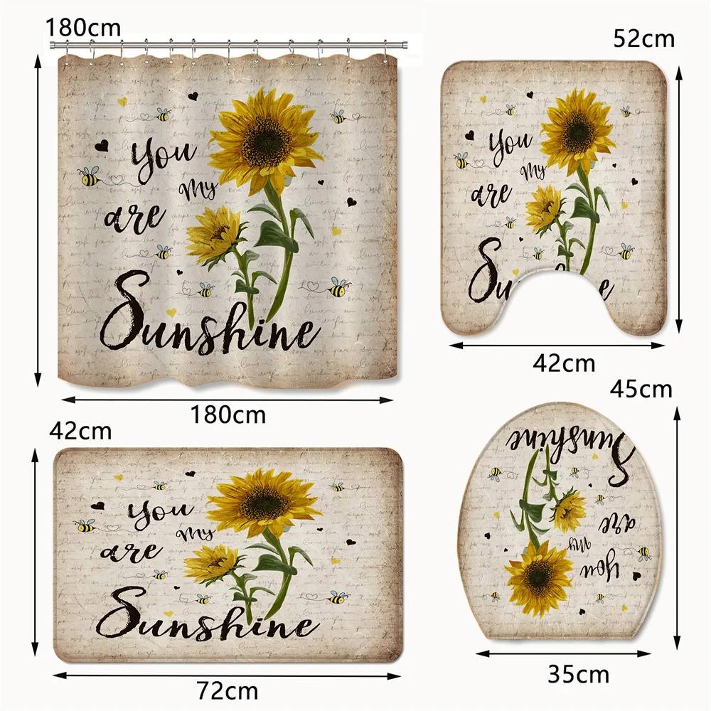 🌻[INFORMACIÓN SOBRE EL TAMAÑO]: Tamaño de la cortina del baño de girasol: 180x180 CM, el tamaño de la alfombra del baño/rugón: L76 CM x W46 CM, el tamaño de la tapa del inodoro: L46 CM x W36 CM, el tamaño de la alfombra en forma de U: L46 CM x W37 CM.Este tamaño de juego de baño es adecuado para la mayoría de baños o aseos.