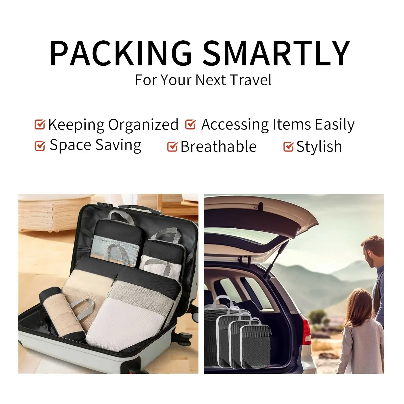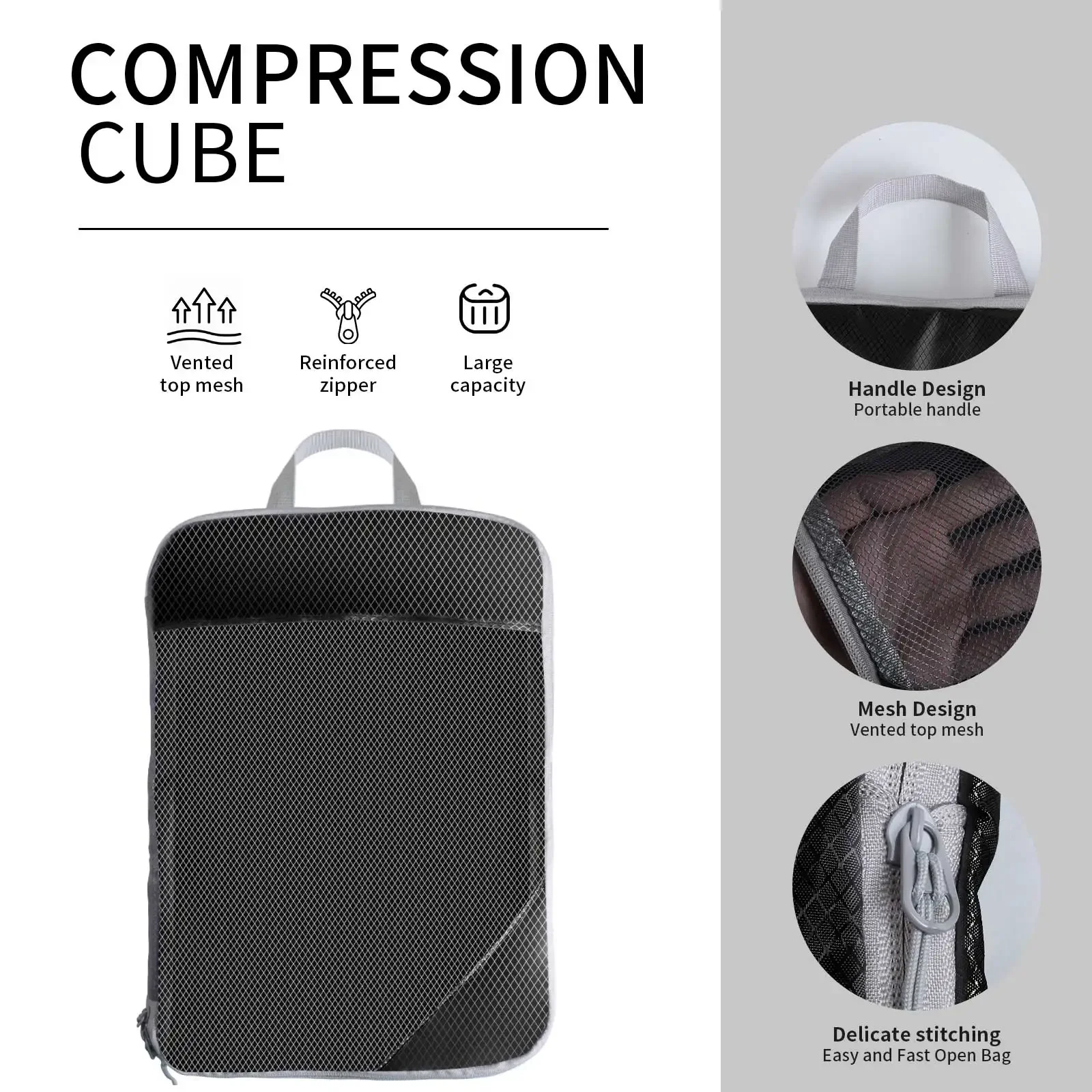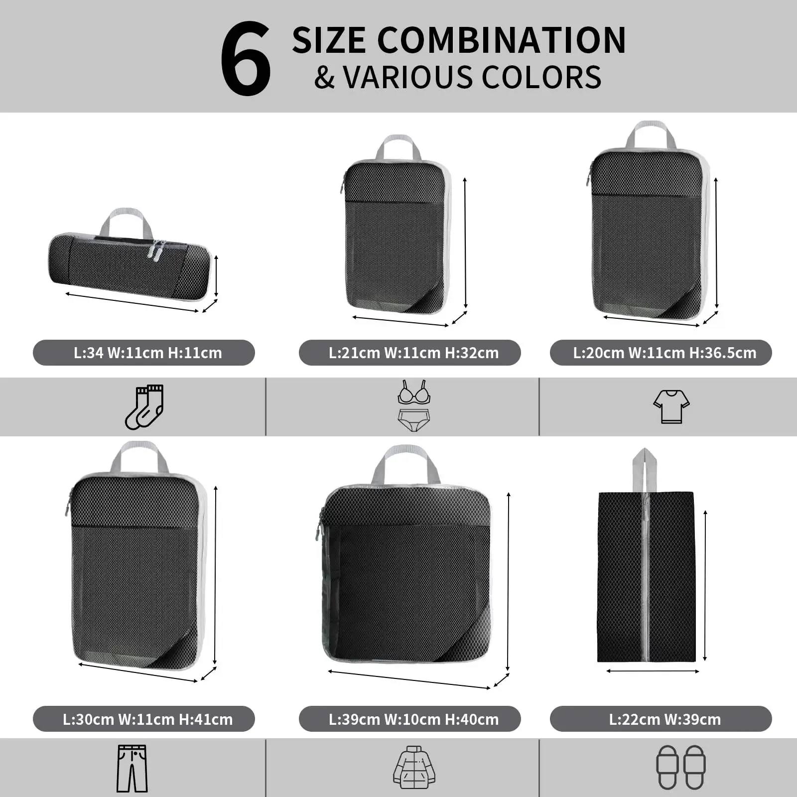 Cubos de embalaje de compresión: ¿Estás satisfecho con el tipo de maleta desordenada de viaje?Viaja con PACKING CUBES y marcan una gran diferencia.Los cubos de embalaje de 6 piezas contienen 4 cubos de viaje + 1 bolsa para zapatos + 1 bolsa para calcetines, mantienen sus conjuntos en cubos de compresión separados y hacen que su equipaje esté limpio y ordenado mientras viaja. Ahorre hasta un 40% de espacio: un cubo de compresión lleva el espacio del equipaje al siguiente nivel.Se hace agregando una cremallera adicional alrededor del exterior que se puede cerrar con cremallera para minimizar el espacio interior, como funciona un sellador al vacío, pero no un vacío. Organizador de maletas duradero: el juego de bolsas de embalaje es liviano, resistente a las arrugas y bastante duradero.La malla resistente al desgarro es fina y fuerte, transpirable mientras puedes encontrar lo que buscas a tiempo.Las cremalleras dobles no solo son suaves, sino que también brindan garantía de calidad al comprimir Elementos esenciales de viaje livianos: la tela ultraligera garantiza que la ropa encaje perfectamente en su equipaje sin agregar peso adicional.Además, las asas en la parte superior de cada cubo facilitan el agarre de las bolsas para empacar y desempacar de su maleta de mano. Juego de bolsas organizadoras: el juego de 6 piezas de gran capacidad incluye un extragrande para chaquetas/abrigos de invierno, grande para chaquetas/suéteres/pantalones, mediano para vestidos/camisas/camillas, pequeño para ropa interior. Bolsa para zapatos con cordón para separar y bolsa para calcetines.