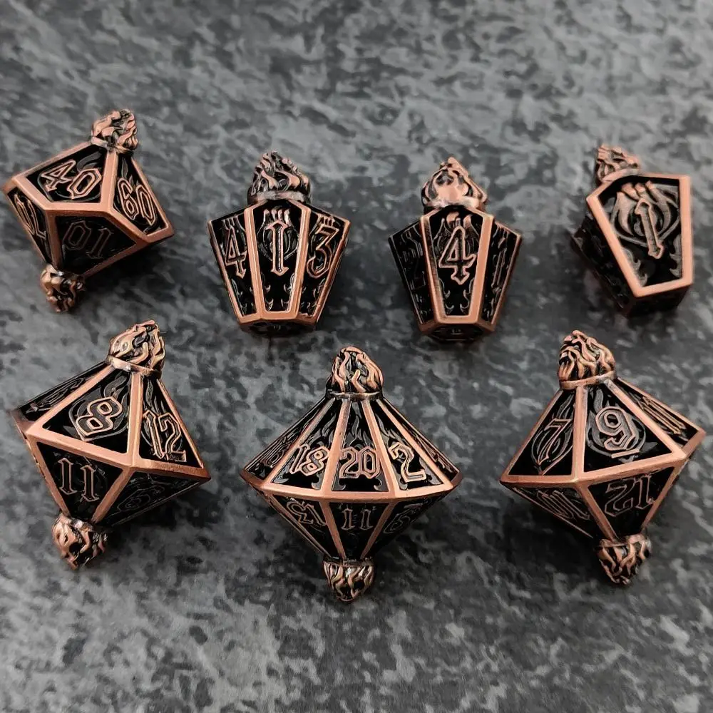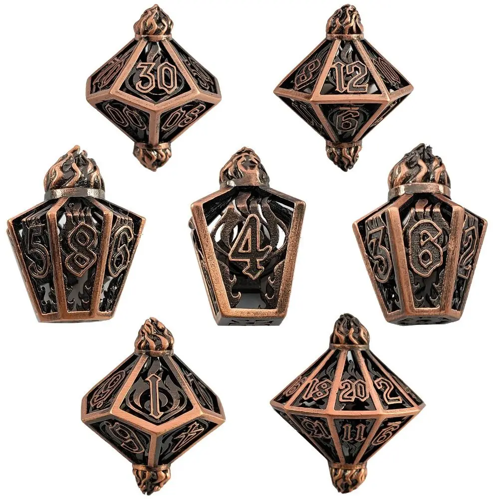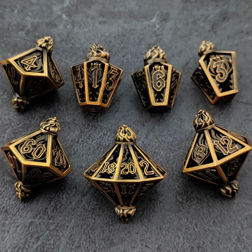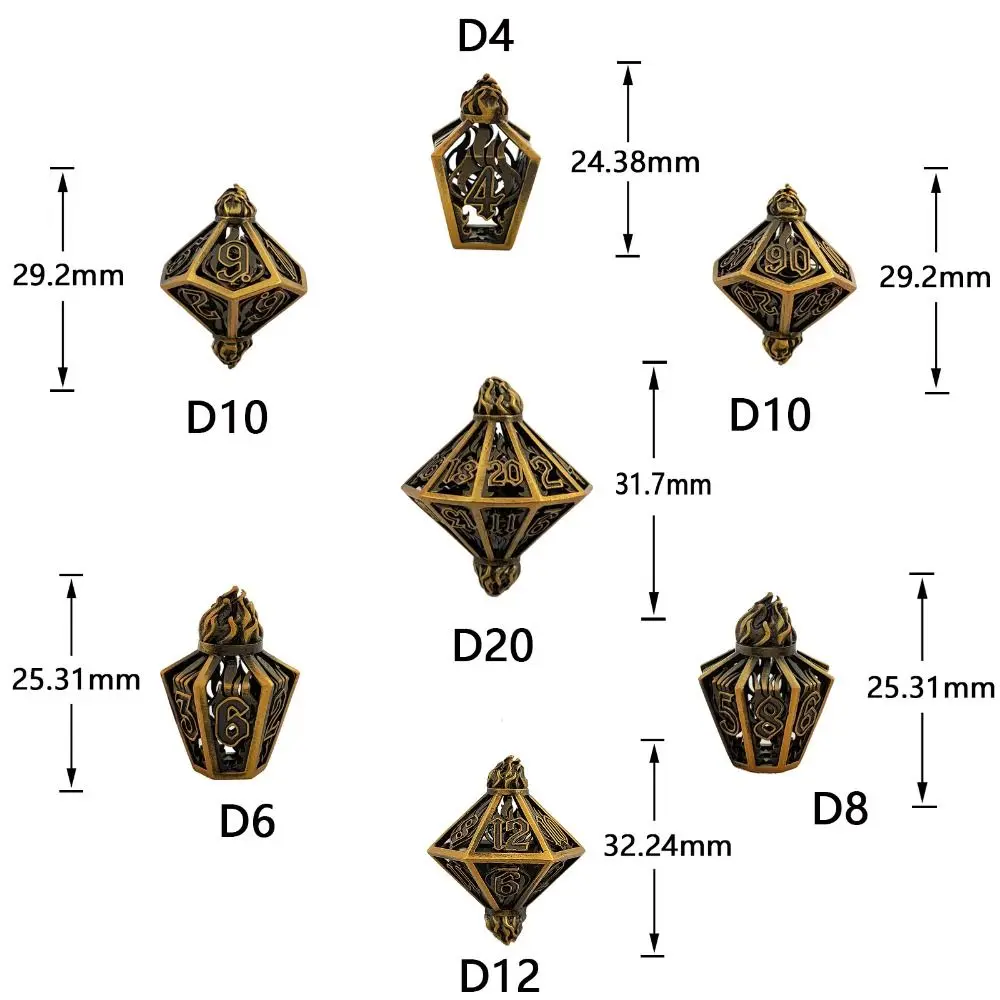 Type: Metal Dice Set Material: metal Size: as the pictures show Color: gold/ copper Weight: about 55g Features: 1.Dice Features: DND Metal Hollow Flame Dice Set. Flame pattern design style, unique appearance, beautifully carved pattern, first-class feel and appearance, bring you a different experience, a collectible gift. 2.Material and net weight: High quality brass casting, durable, easy to read, long life. Net weight: 2.0 oz (57.5 g), rolling well balanced 3.Packaging: 7 pieces/set, including D20, D12, D10, D10, D8, D6, D4 4.Purpose: Can be used in RPGS, D&D, Yachting, Shadow Run, Savage World, Yahtzee, Heroscape, COC, board games, card games, math instruction, or anything else you can think of. Package Include: 7PCS/Set Metal Dices Notes: The product may have an error of 1-2cm,and the color may look a little different from the picture,pls understand.