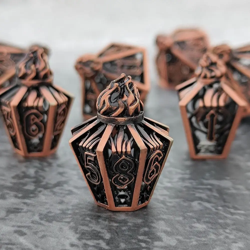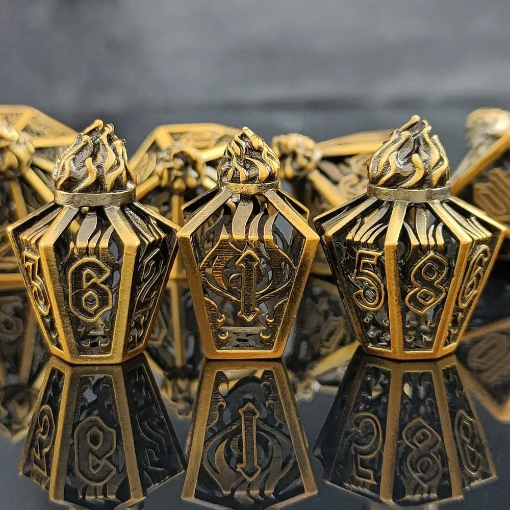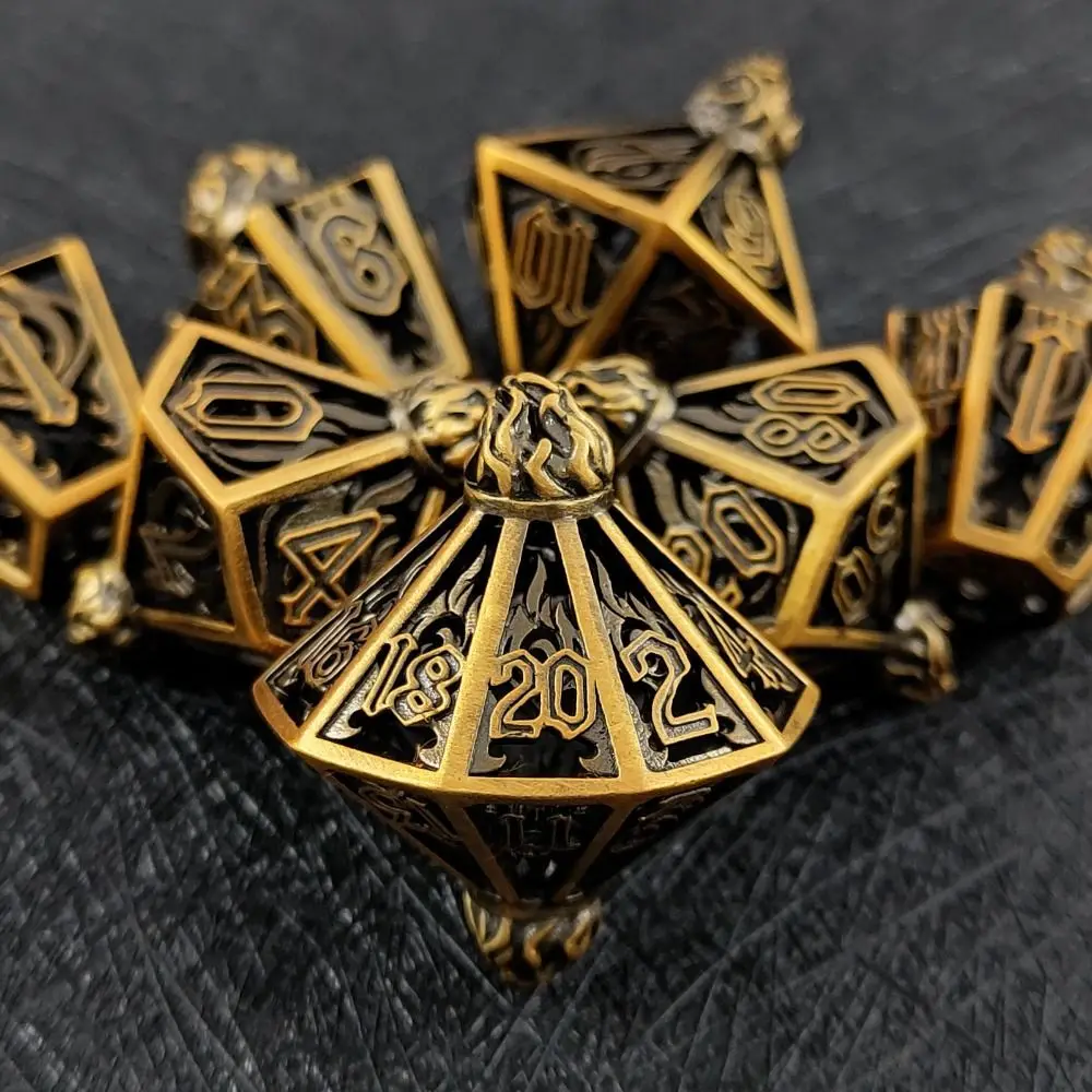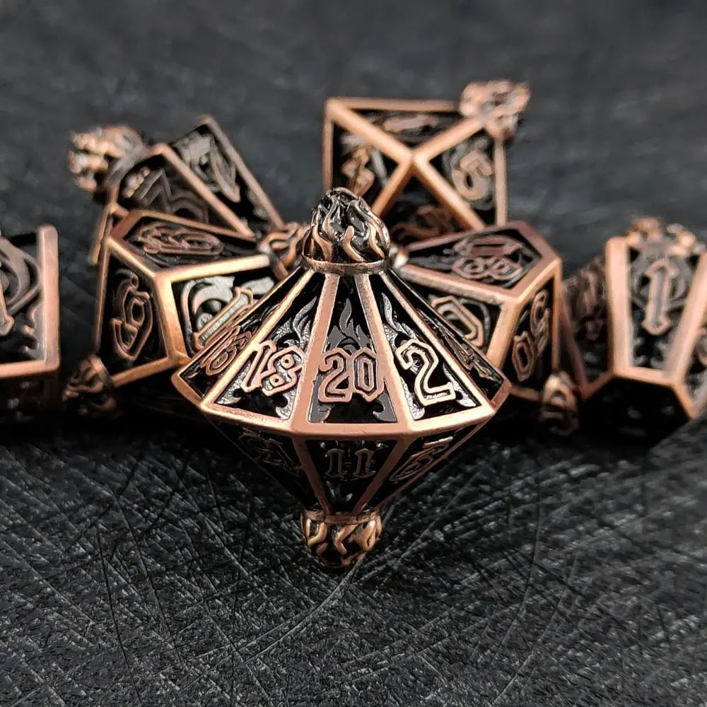 Type: Metal Dice Set Material: metal Size: as the pictures show Color: gold/ copper Weight: about 55g Features: 1.Dice Features: DND Metal Hollow Flame Dice Set. Flame pattern design style, unique appearance, beautifully carved pattern, first-class feel and appearance, bring you a different experience, a collectible gift. 2.Material and net weight: High quality brass casting, durable, easy to read, long life. Net weight: 2.0 oz (57.5 g), rolling well balanced 3.Packaging: 7 pieces/set, including D20, D12, D10, D10, D8, D6, D4 4.Purpose: Can be used in RPGS, D&D, Yachting, Shadow Run, Savage World, Yahtzee, Heroscape, COC, board games, card games, math instruction, or anything else you can think of. Package Include: 7PCS/Set Metal Dices Notes: The product may have an error of 1-2cm,and the color may look a little different from the picture,pls understand.