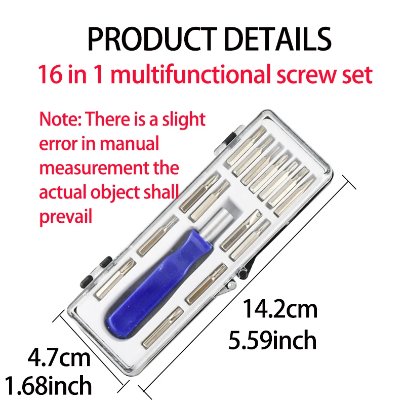 • Conjunto multifuncional de destornilladores :Este conjunto de destornilladores multifuncional incluye 16 piezas, proporcionando una solución completa para cualquier necesidad de reparación en el hogar.