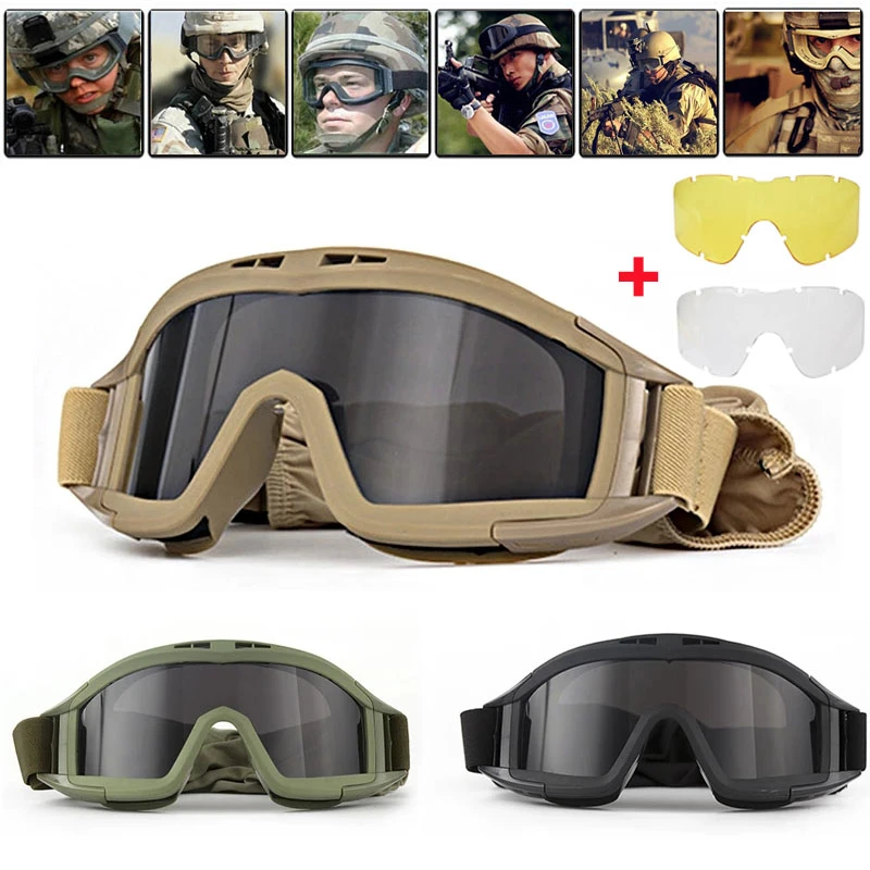 Juego de gafas tácticas de 3 lentes, a prueba de viento, a prueba de polvo, Motocross, motocicleta, gafas de montañismo, protección de seguridad militar Cs