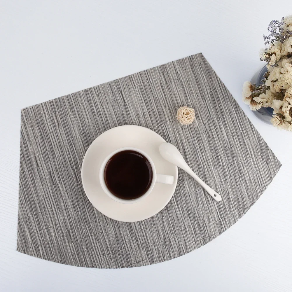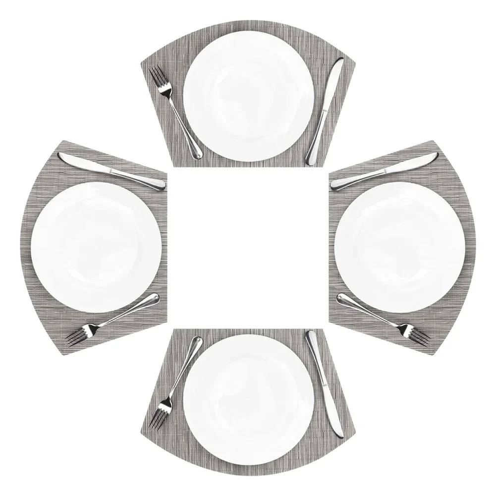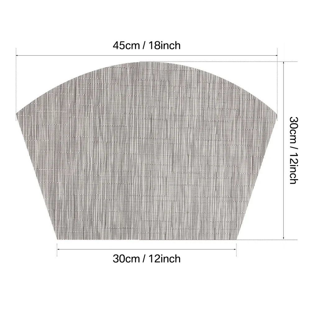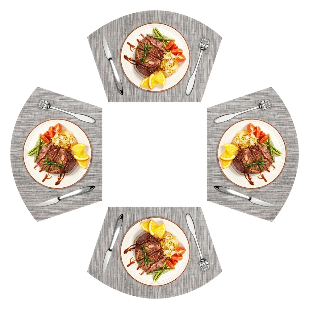 MATERIAL DE ALTA CALIDAD: El mantel individual está hecho de 70% PVC + 30% poliéster y es saludable y respetuoso con el medio ambiente.Este mantel es puro y elegante, se utiliza perfectamente como decoración de mesa, haciendo que su comedor sea cómodo.DIMENSIONES: Incluye 4 piezas de manteles individuales con cuña, cada una mide: 45 cm x 30 cm (18 " x 12").(Hay un error de aproximadamente 1 cm).RESISTENTE AL CALOR: El aislamiento eficaz de estos manteles individuales de mesa podría alcanzar los 80℃, que puede proteger su mesa de comedor de quemaduras y crear un ambiente de comedor feliz para sus familias.FÁCIL DE LIMPIAR: Puedes lavar estos manteles individuales tejidos o simplemente necesitas limpiarlos.No mancha, no se decolora, se seca rápidamente.DECORACIÓN PERFECTA: Formas de cuña únicas y manteles individuales centrales, especialmente adecuados para mesas redondas.Podría usarse para mesa de comedor, escritorio de computadora, restaurante, oficina comercial u otras actividades al aire libre.Sería una buena decoración y calidad de vida para su hogar, comedor, cocina, hotel y oficina comercial.