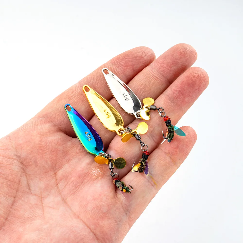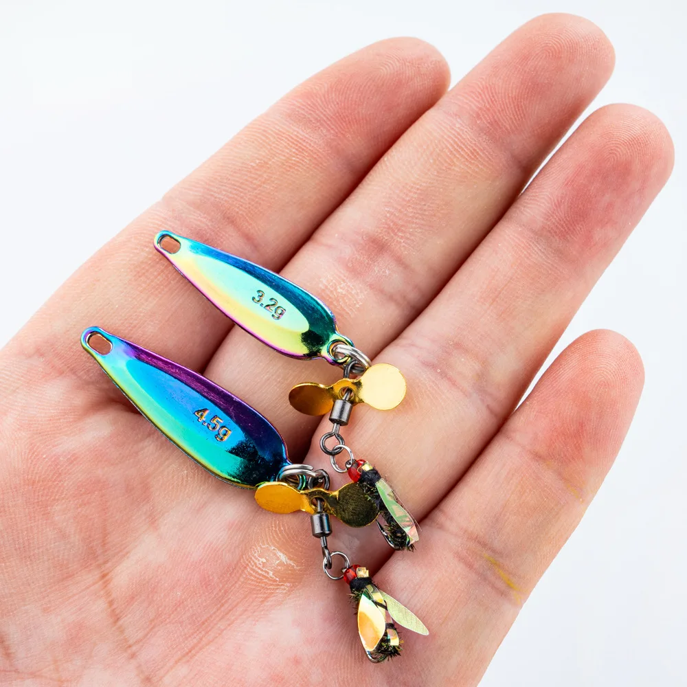 Juego de pesca con mosca de 3,2g y 4,5g, hélice giratoria, lentejuelas de melón, cebo falso, Micro juego de pesca, cola de caballo, cebo de rayas blancas