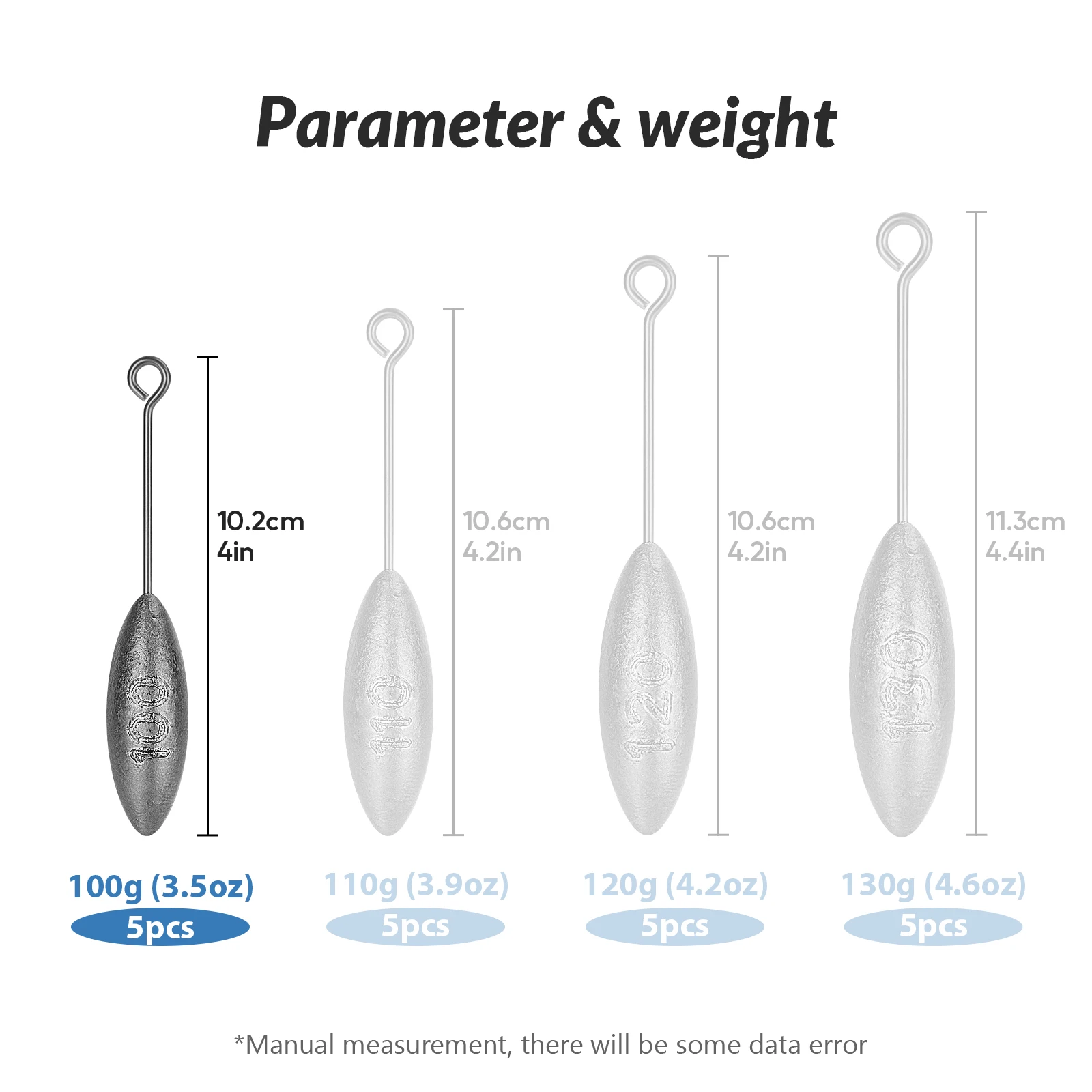 Varios tamaños para usar y compartir: Recibirá 5/8 piezas de plomos de pesca en diferentes tamaños, aproximadamente 100g (3,5 oz),110g (3,9 oz),120g (4,2 oz),130g (4,6 oz), suficiente para satisfacer sus necesidades diarias de pesca, y también puede compartirlas con sus socios