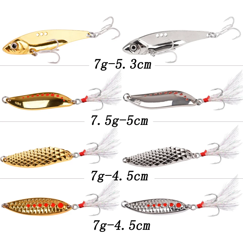 Juego de señuelos giratorios de Metal de 8 unids/set, Set de ganchos de pesca de oro y plata, 7g, 7,5g, señuelos giratorios de pesca de lentejuelas, anzuelos triples, cebo duro