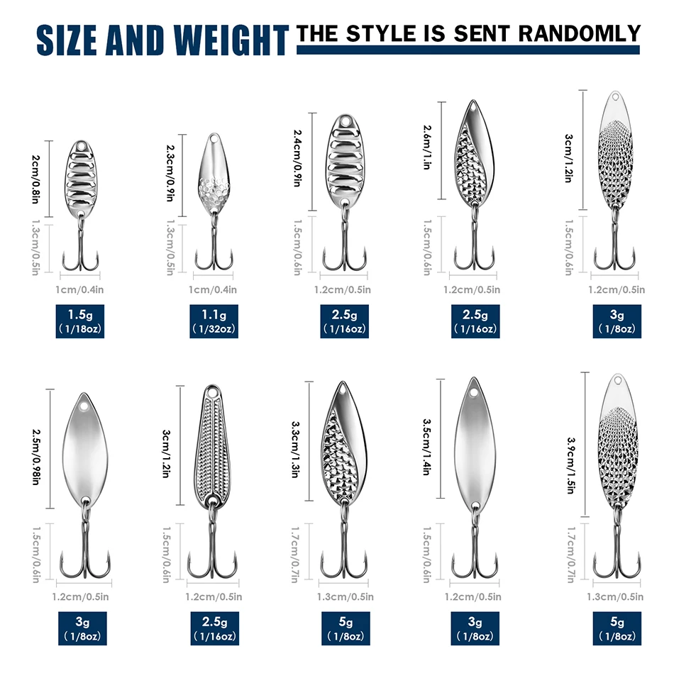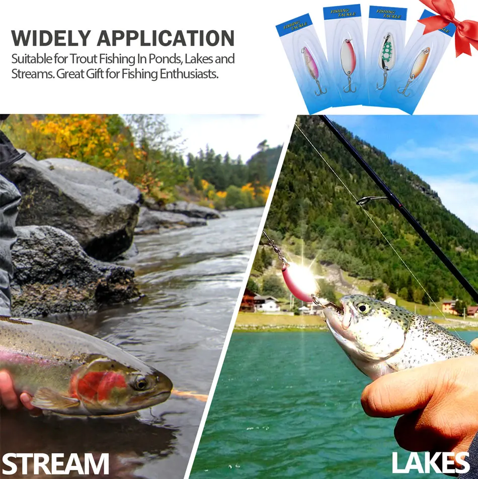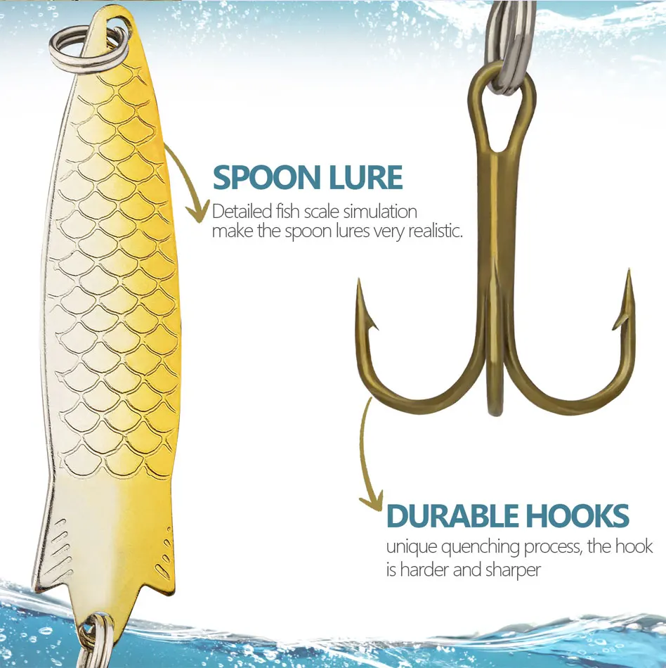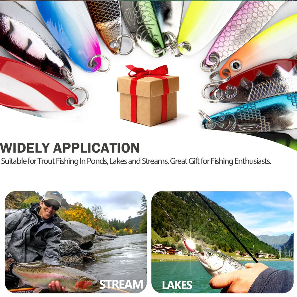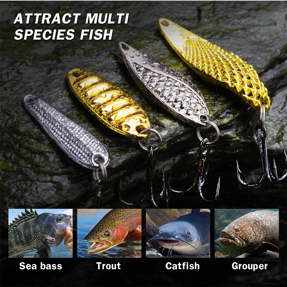 4. Múltiples usos: Estos señuelos de cuchara de pesca son adecuados para truchas, lubinas, peces gatúteos, grouper,etc. Pesca en lagos y arroceras, estanques. Todos los señuelos vienen en una caja multipartición, fácil de manejar y portátil. Gran regalo para los entusiastas de la pesca.